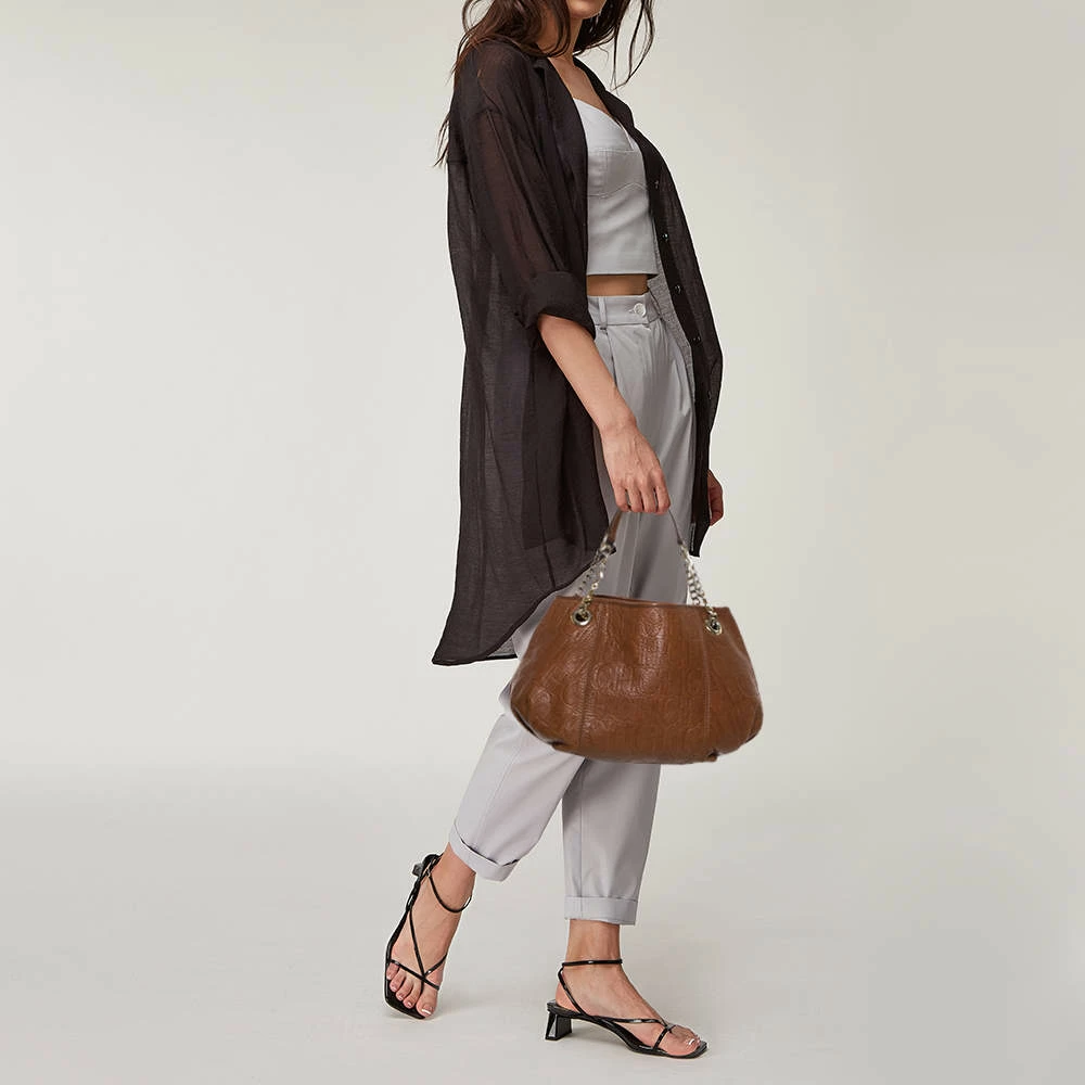 This hobo by Carolina Herrera offers delighting details. Crafted from the brand’s signature Monogram embossed leather, it features a relaxed silhouette. It comes with dual chain handles and a fabric interior with enough space to house your essentials. This bag is a great option for everyday use.