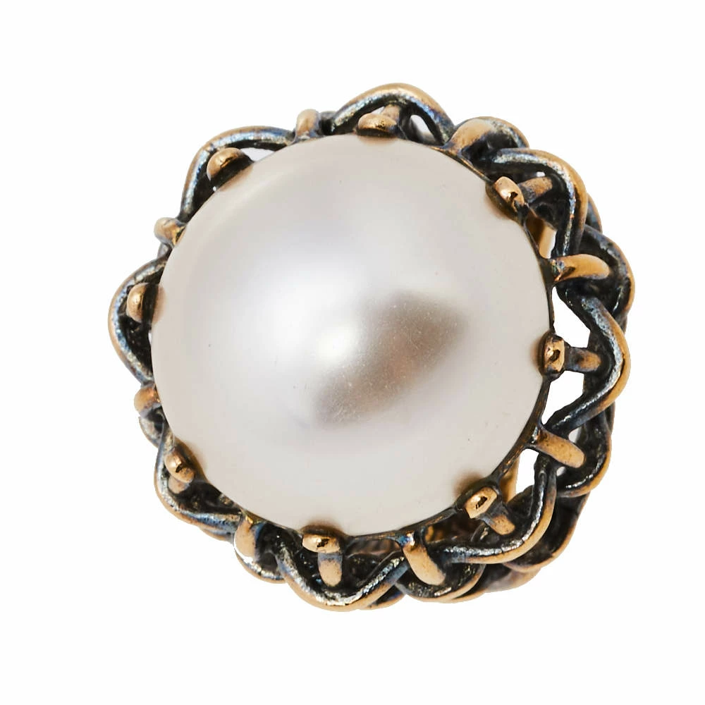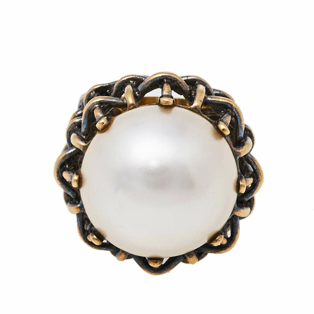 This statement ring by Carolina Herrera has a faux pearl mounted on a gold-tone metal band. The caged extensions that hold the pearl, the signature engravings, and the smooth finish add to the beauty of this splendid creation. Make it yours today!