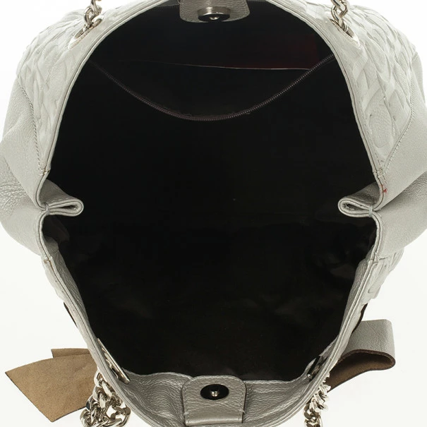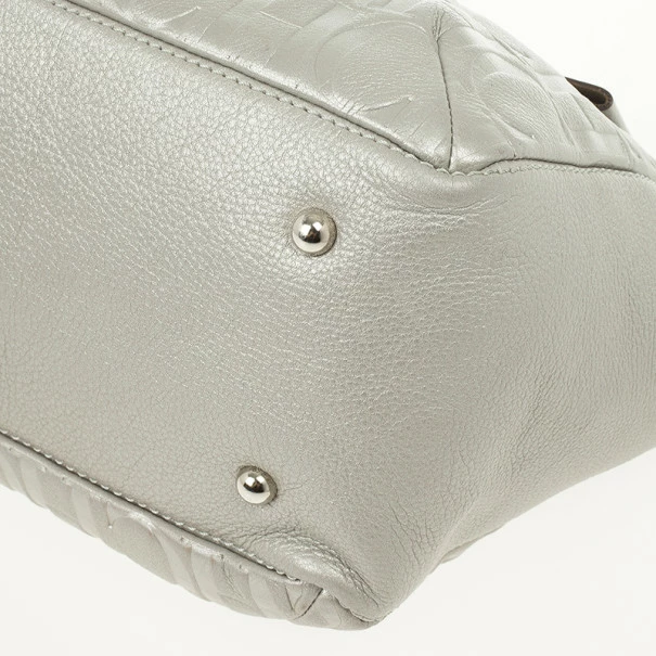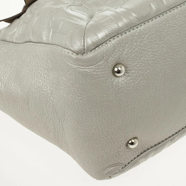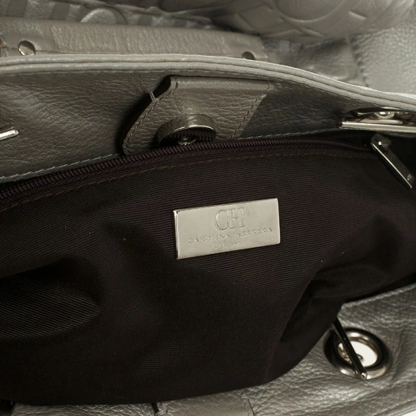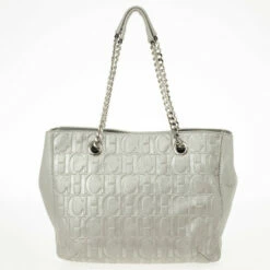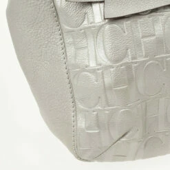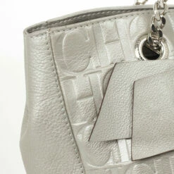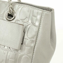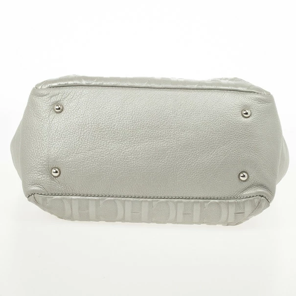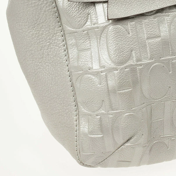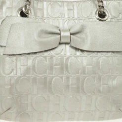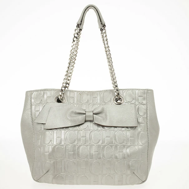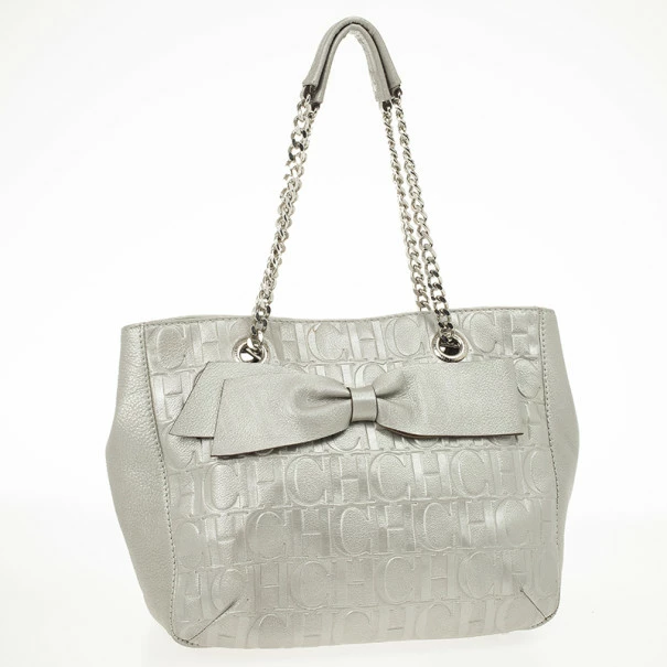 Paint the town silver with this New Anna bag by Carolina Herrera. This bag is made from monogram embossed leather and features CH marked silver toned hardware and two chain-link and leather handles. A bow tie is accenting the exterior on front. The canvas lined interior comes with one large zipper pocket.Original Retail Price: US $937