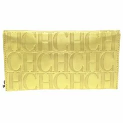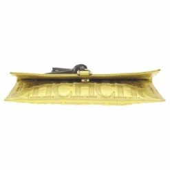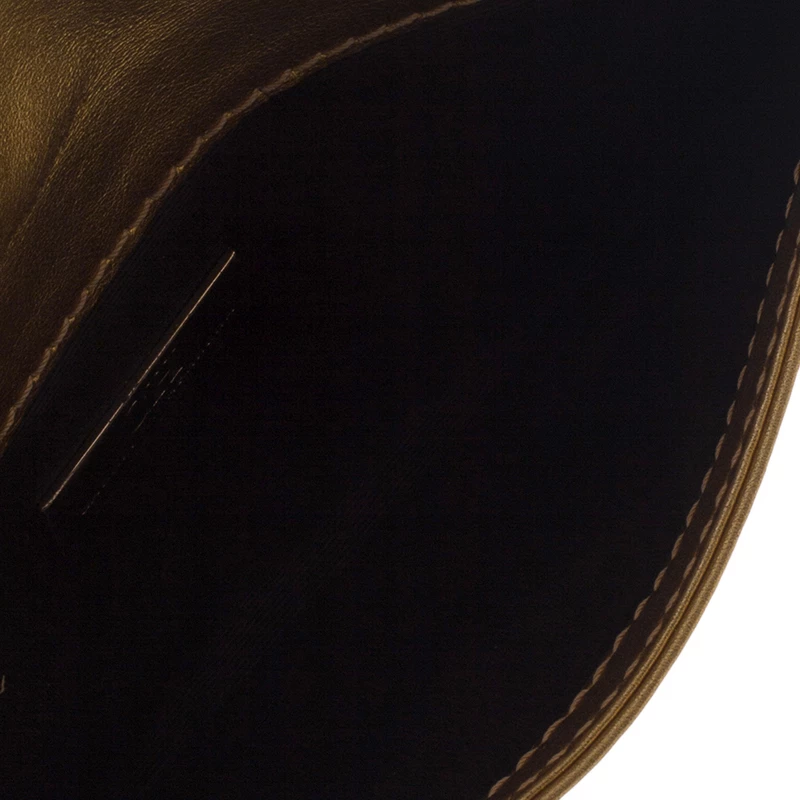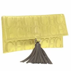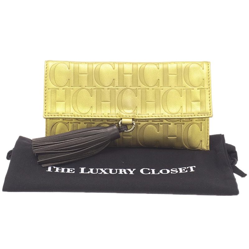 Add elegance to your formal attire with this lovely clutch from Carolina Herrera. Crafted in metallic gold leather, it is embossed with CH monogram. It features a bold bronze leather tassel attached with the front flap. Secured with a snap closure, the interior is lined with metallic brown leather, housing with one patch pocket.