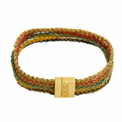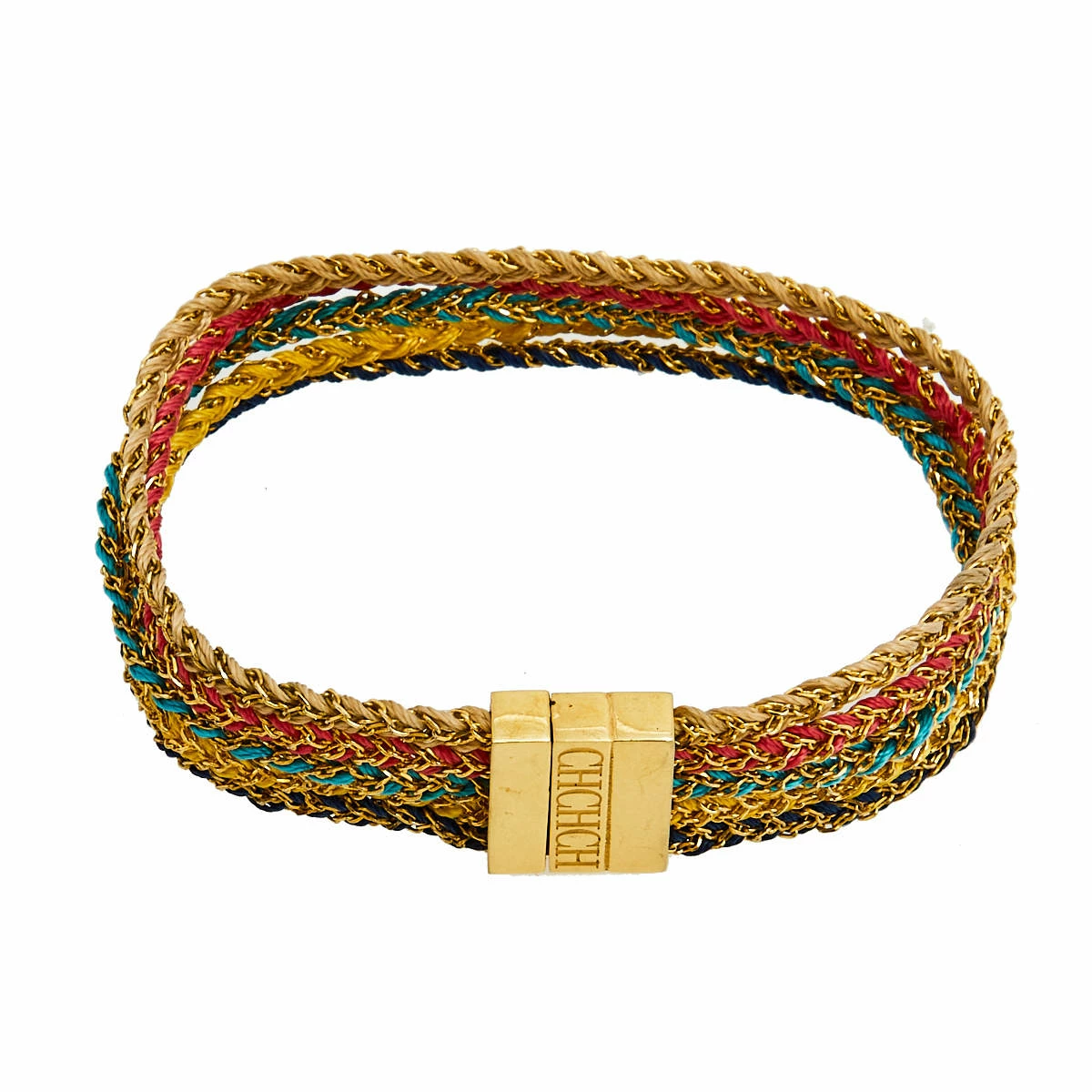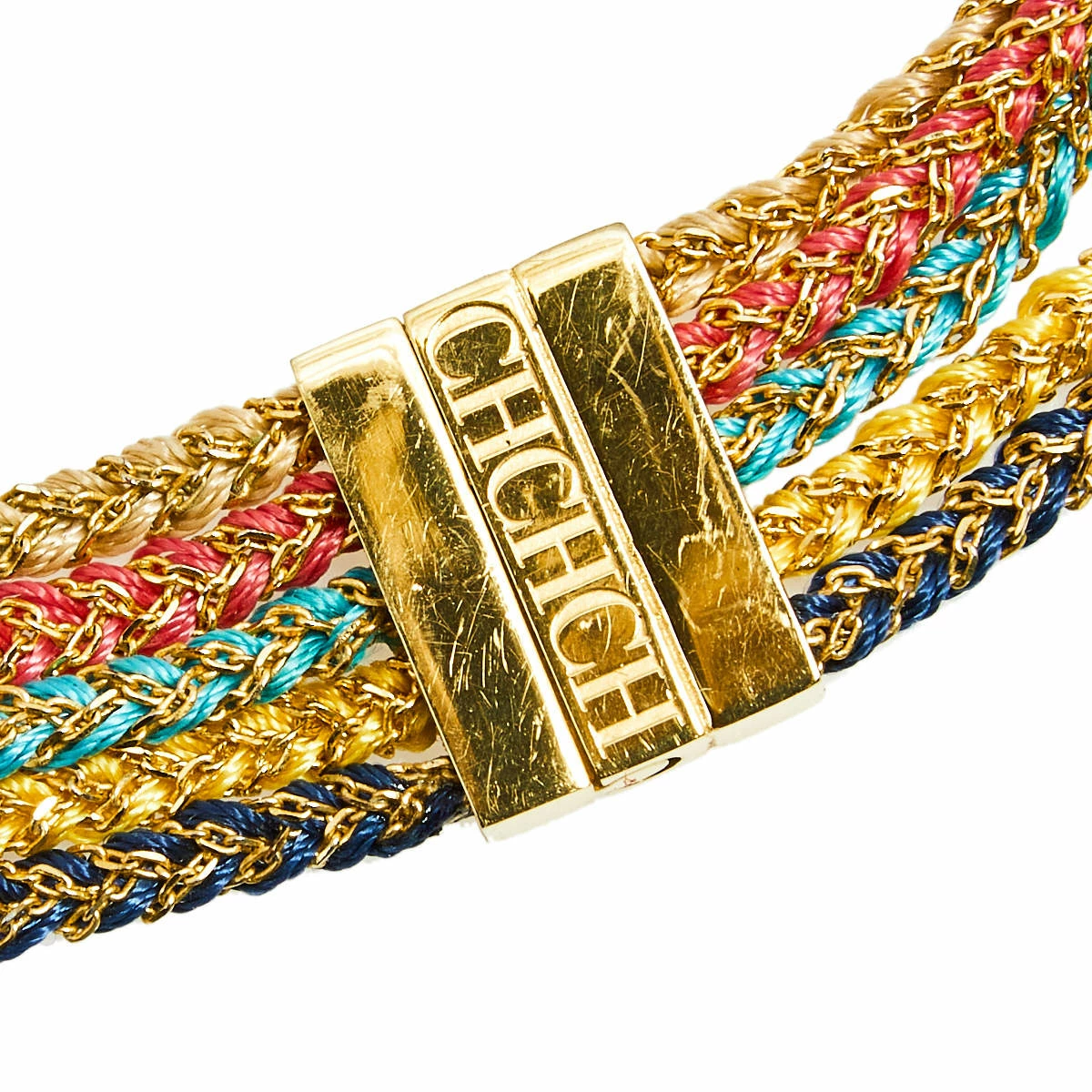 Get a dainty look with this flawless Carolina Herrera chain multi-strand bracelet. The design involves four strands of colorful fabric woven into the gold-tone metal chains. The end result is one that is eye-catching and comfortable to wear.