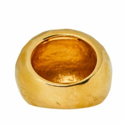 Projecting a statement look even without embellishments, engravings or cut-outs, Carolina Herrera’s cocktail ring is a standout creation. It is formed using gold-tone metal into a dome-shaped design and the top surface is set with hammered textures.