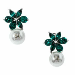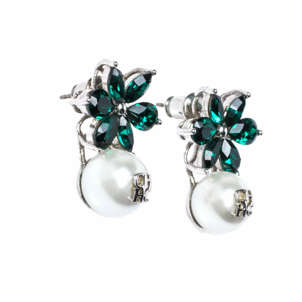 These green crystal earrings from Carolina Herrera are dainty and gorgeous. It is embellished with silver-tone CH signature on the faux pearls. This beautiful pair from the Crystal Jasmine collection is ageless and versatile.
