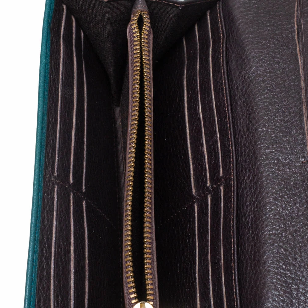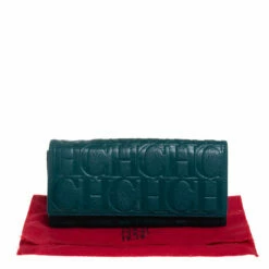 Ensure your essentials are in place with this Continental wallet from Carolina Herrera. Crafted using monogram embossed leather, the green wallet for women has a flap closure to secure the well-designed interior.