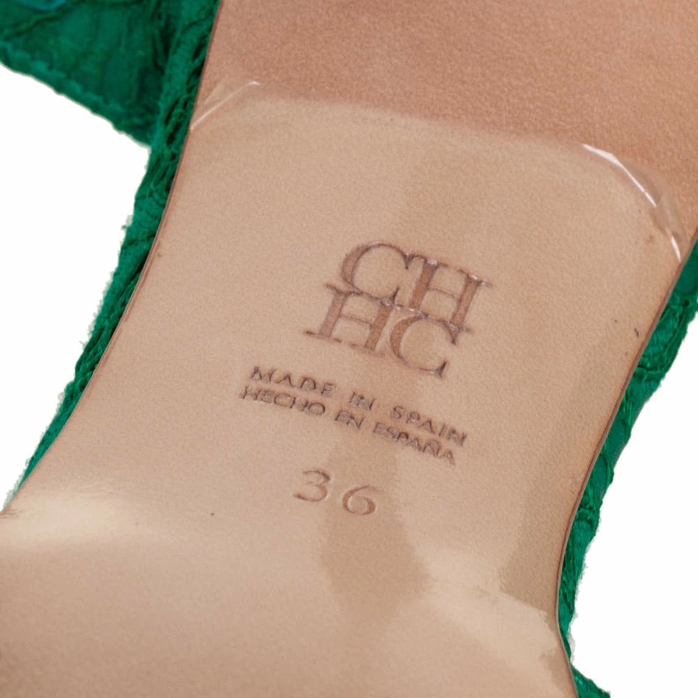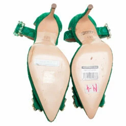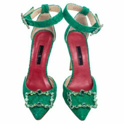 These pumps from Carolina Herrera will enchant you with their timeless beauty, poise, and charm! They are crafted using green lace and satin, with a crystal-embellished accent placed on their pointed toes. They are elevated with a crystal-embellished buckle on the ankle strap, gold-tone hardware, and slim heels.