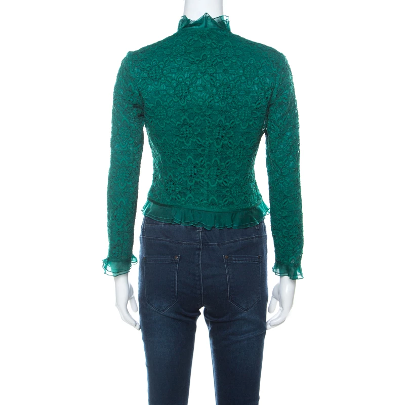 This green jacket from Carolina Herrera is gorgeous! Made from floral lace, it is styled with silk ruffle trims on the placket, hem and long sleeves. Crystal buttons and a feminine silhouette make it ideal to your complete your ladylike looks.
