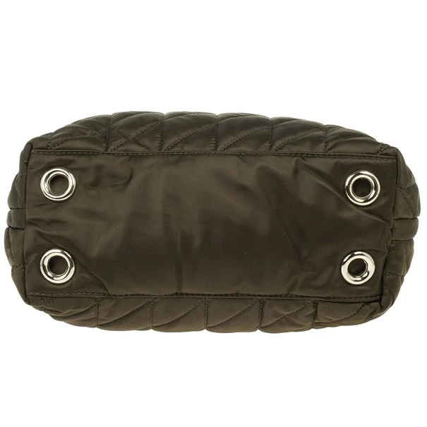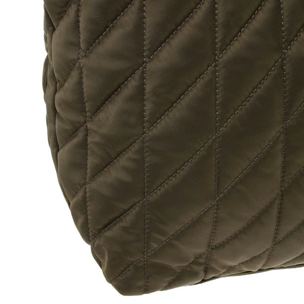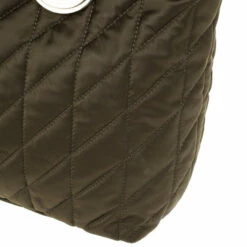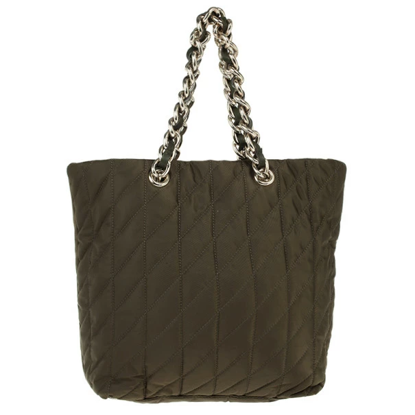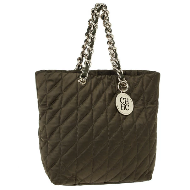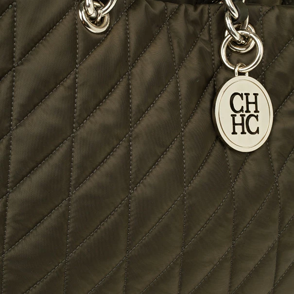 Enhance your look with this fabulous green quilted tote by Carolina Herrera. Featuring a large silver ‘CH’ charm with matching double chain link and leather shoulder straps, this bag will go with any outfit. The large canvas-lined interior features one zipped pocket and just enough space to carry it to work or when out on the town!