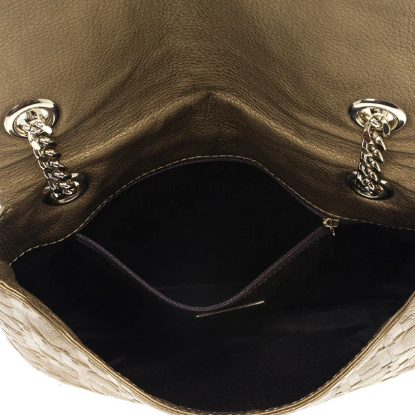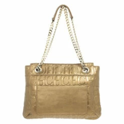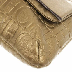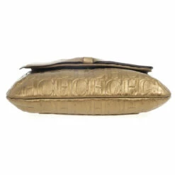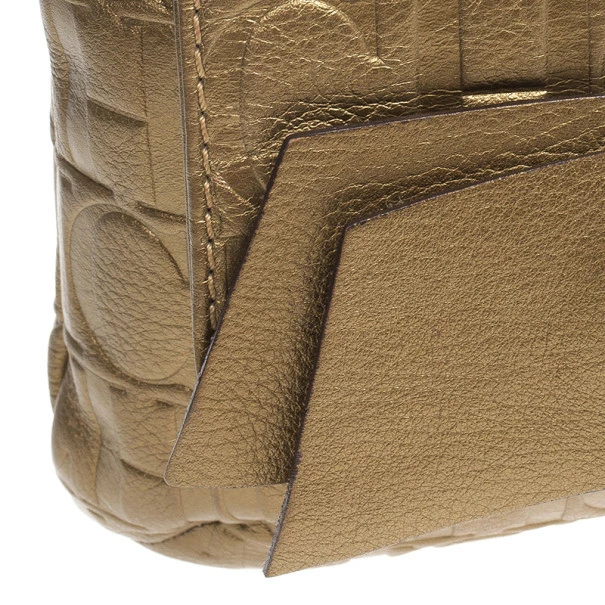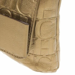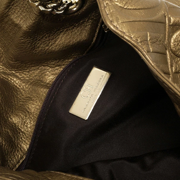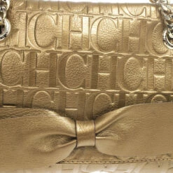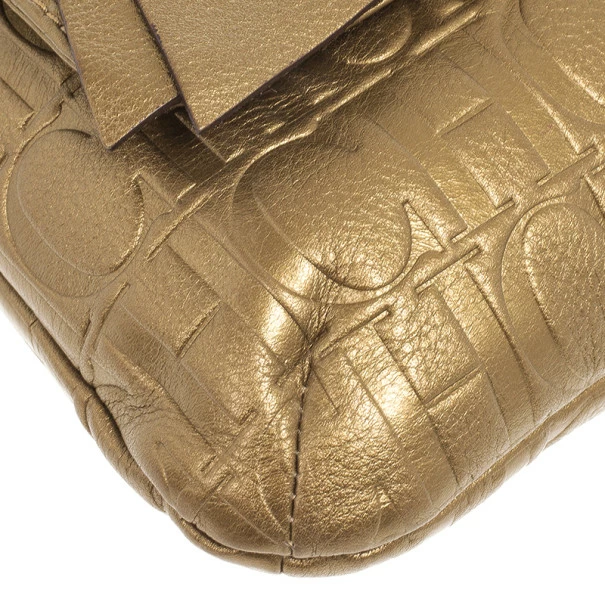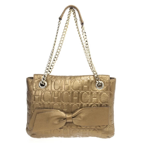 This Holly bag from Carolina Herrera’s Audrey collection is an attractive handbag for your wardrobe. Crafted from metallic gold CH monogram leather, the exterior is accented with a leather bow, flap front closure, chain-link and leather straps for comfortable carrying and gold hardware. The black canvas lined interior features a zip pocket.Original Retail Price: US $786