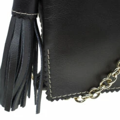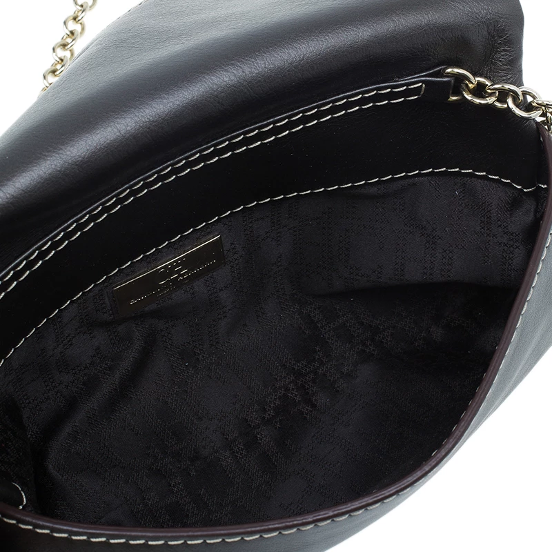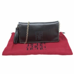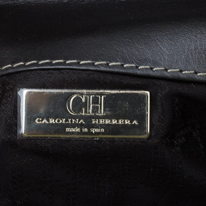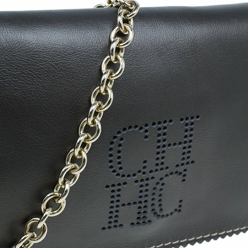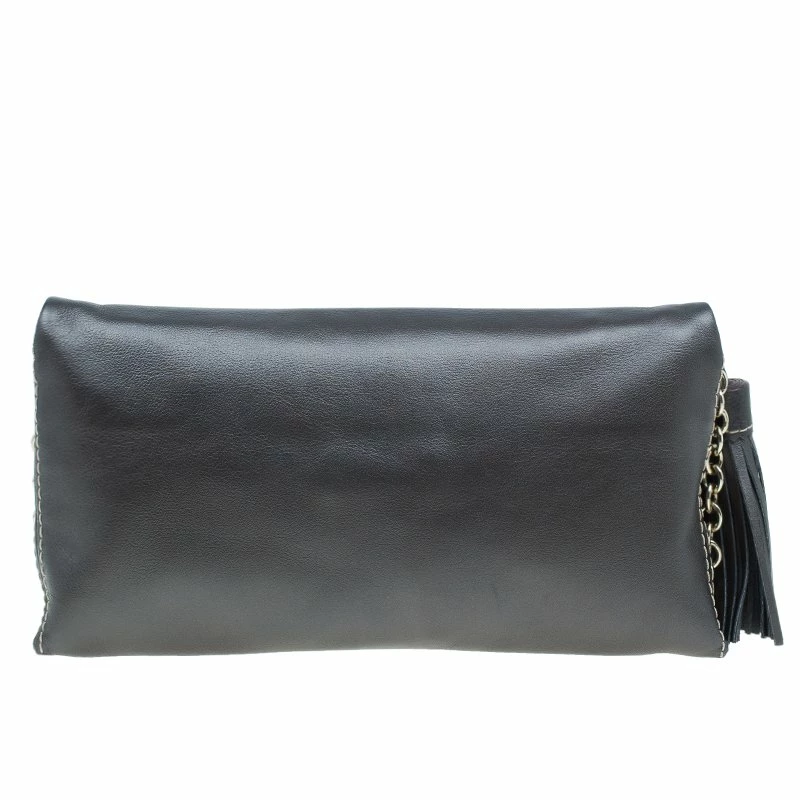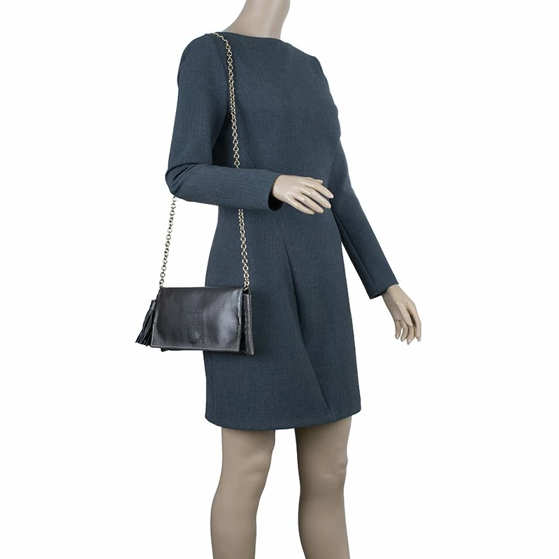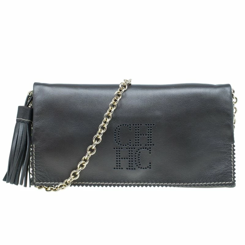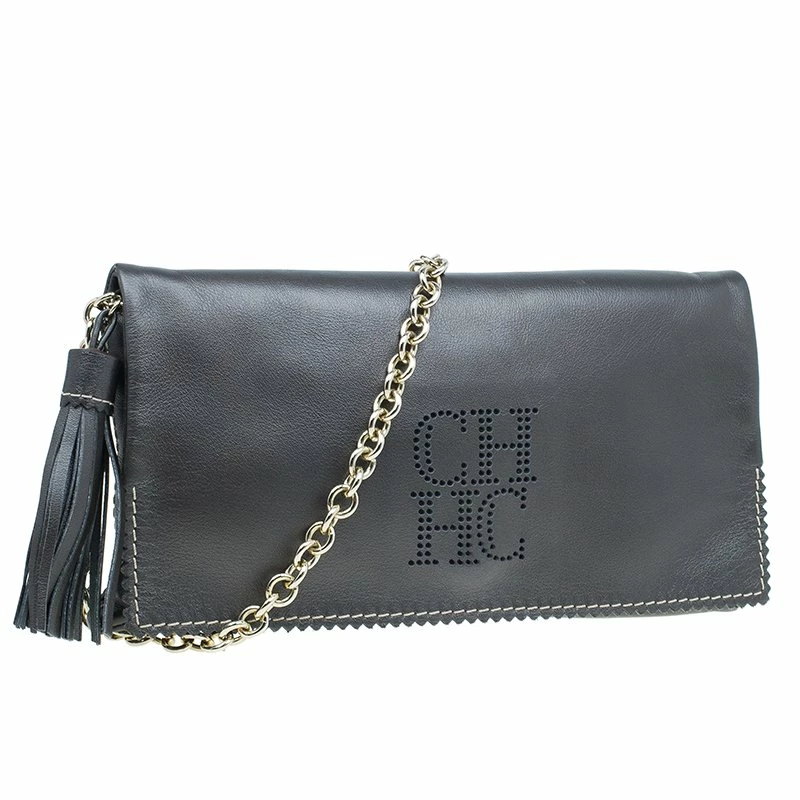Pair this Carolina Herrera Clutch with almost any outfit on a fun night out! Crafted from dark grey leather, it comes with a contrasting CH HC monogram stitch at the front. The clutch is embellished with leather tassel and gold-tone chain-link removable shoulder strap. The front flap opening has a magnetic snap closure and opens to a fabric lined interior, housing one zipped pocket and a gold-tone logo plaque.