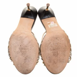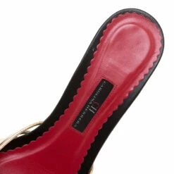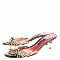 Create your own statement when you slide on these sandals by Carolina Herrera. The exterior is made from leather and features gold-tone straps with a CHHC engraved metal charm. The sandals are equipped with thin and short heels. The insoles are red leather padded with the brand logos.