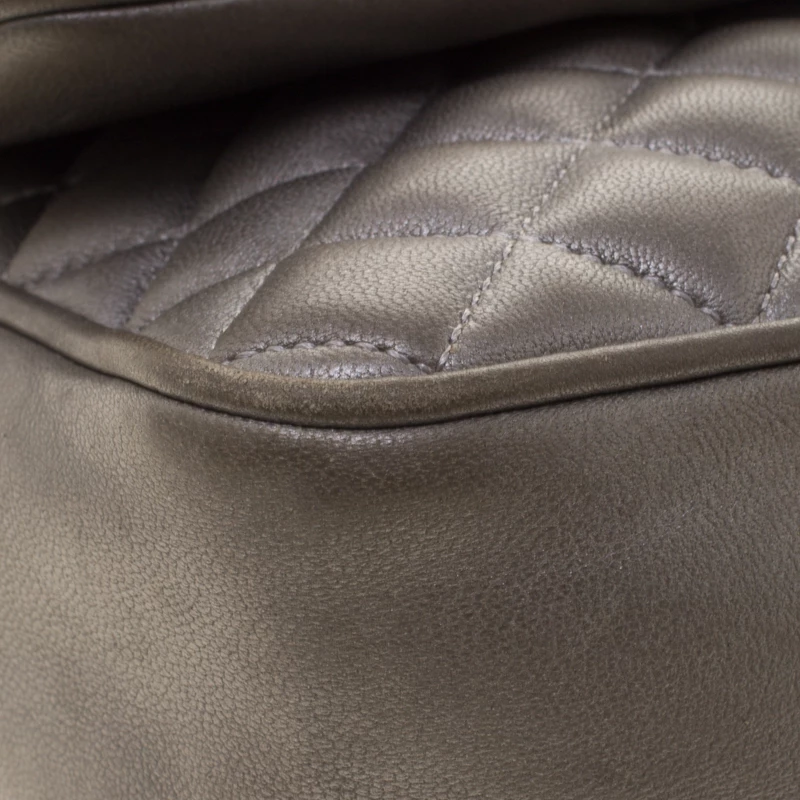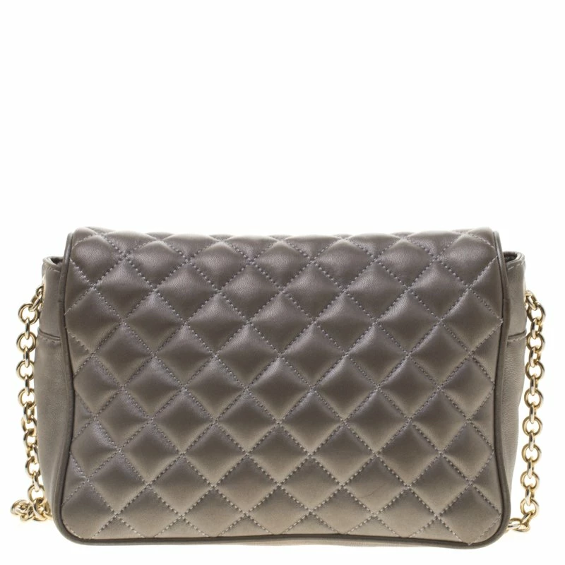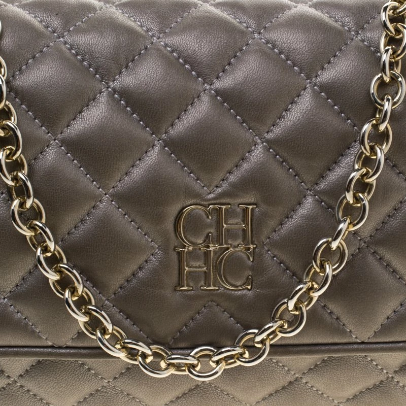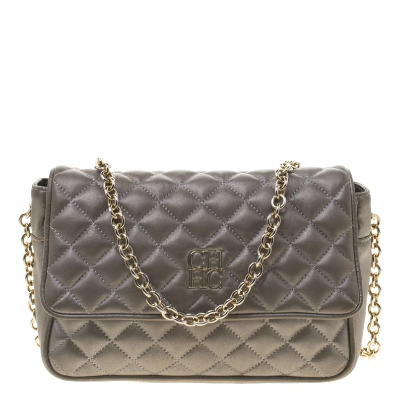 Carolina Herrera’s shoulder bags are a must-have! The metallic grey colored leather bag features a quilted pattern. It has an interlinked chain strap with a gold-tone brand logo plaque on the front flap that opens to a fabric lined interior with enough space to keep your daily essentials. Pair this up with your dresses and gowns for a dazzling gala look.