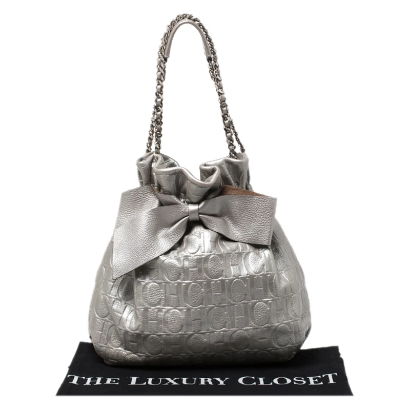 Adorn this Bow Bucket bag from Carolina Herrera that is gorgeous and durable. The bag is crafted from leather and styled with a bow on the front. It features a chain and leather strap and a nylon interior sized to hold your belongings.