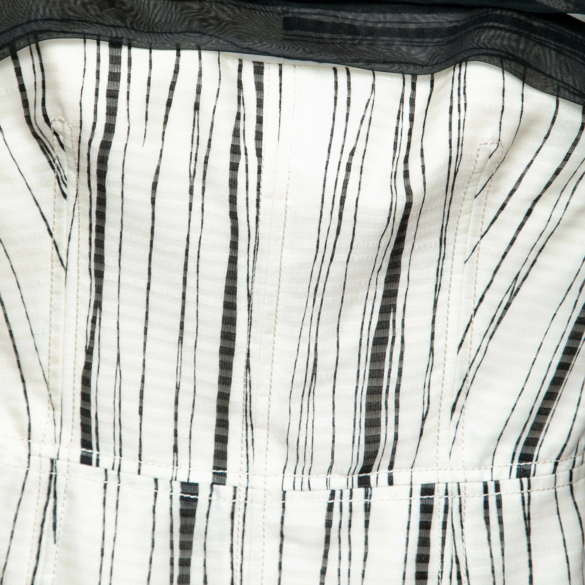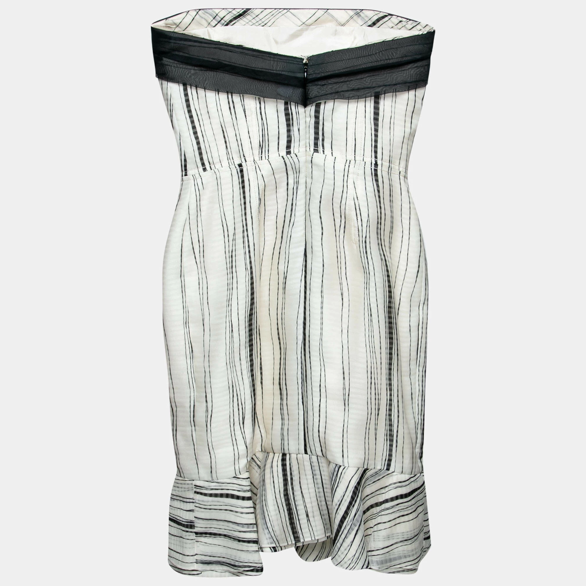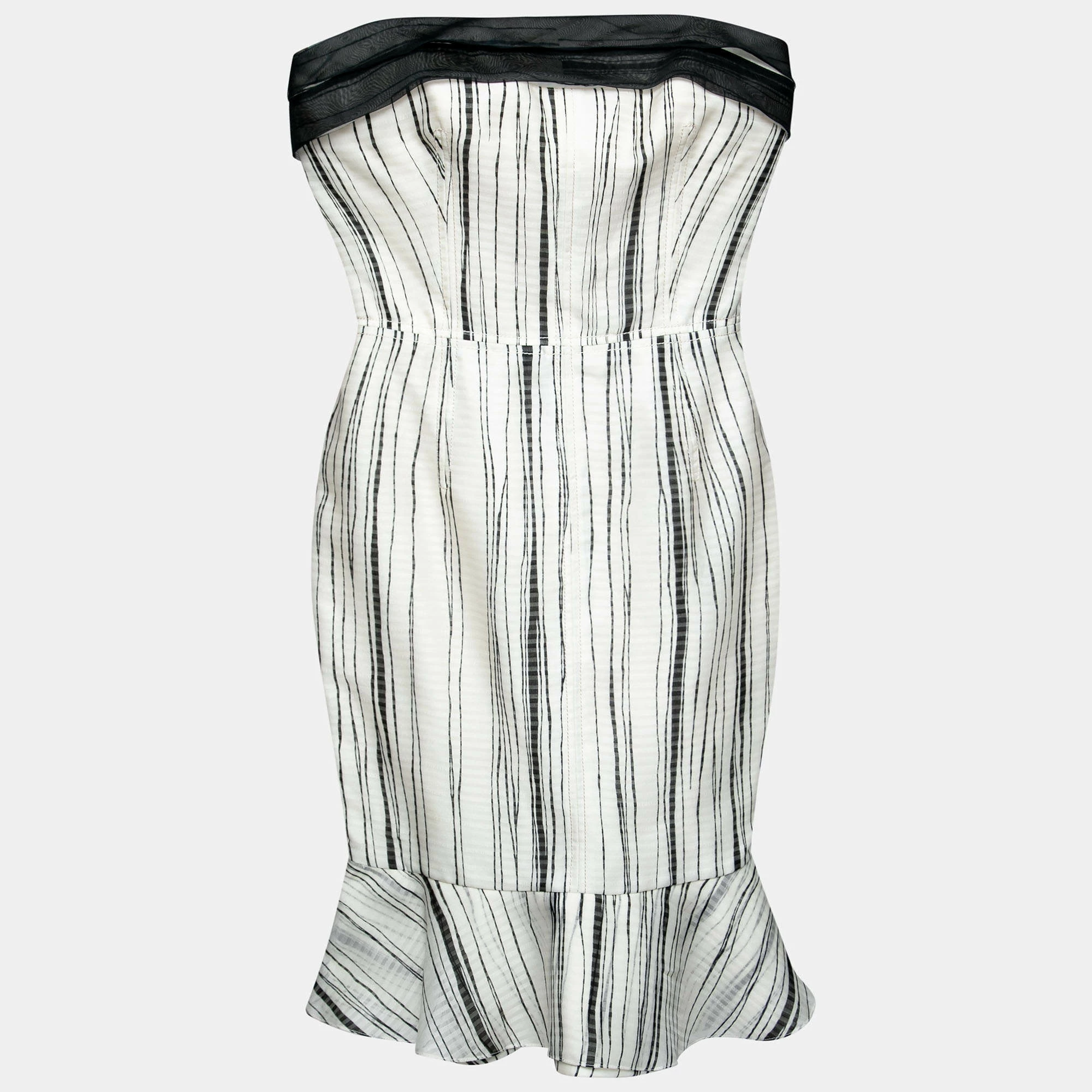 How lovely is this dress from Carolina Herrera! The monochrome creation is made of 100% silk and features a flouncy design at the rear. It flaunts a strapless silhouette and an irregular striped pattern all over. Pair it with stilettoes and a clutch for a fashionable outing.