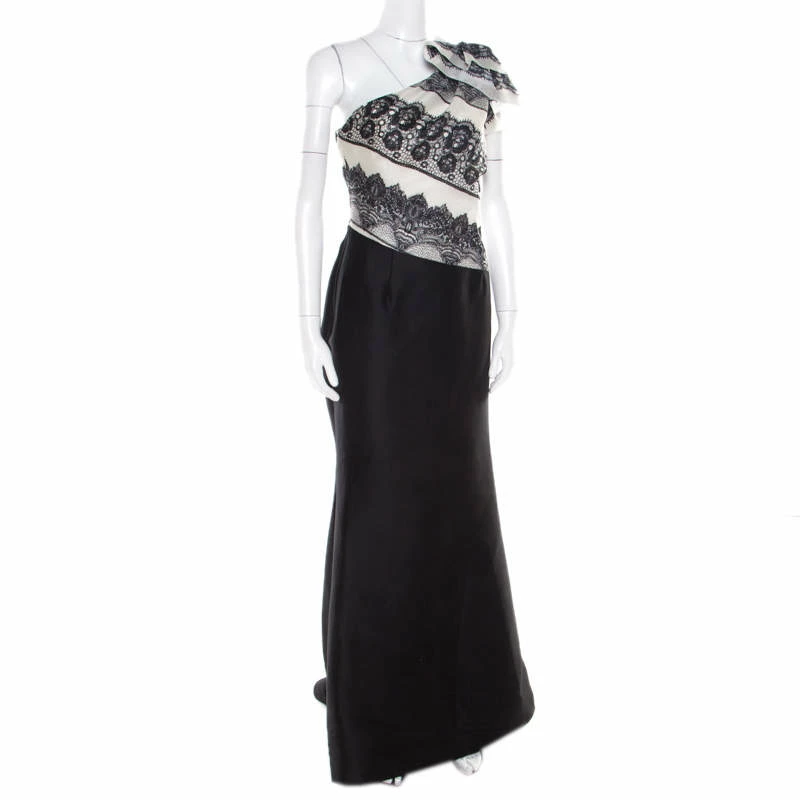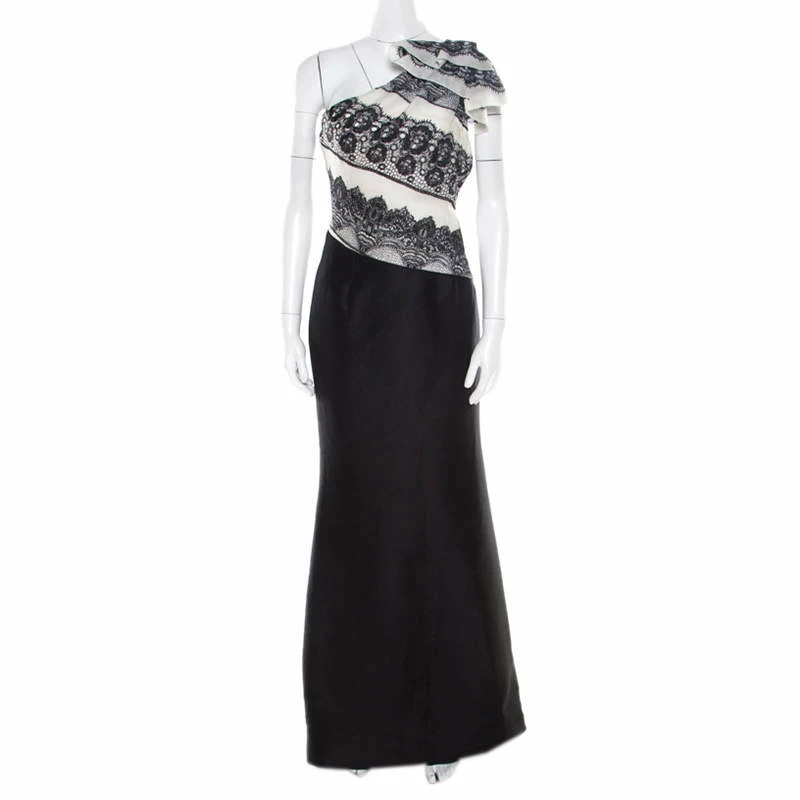 This one shoulder evening gown from Carolina Herrera is sure to make you the centre of attraction and grab you never ending compliments! The monochrome creation is made of 100% silk and features a flattering feminine silhouette. It flaunts a lace print and a ruffle detailing on the bodice and the shoulder strap and comes equipped with a zip closure. It’ll look best with an embellished clutch and platform sandals!