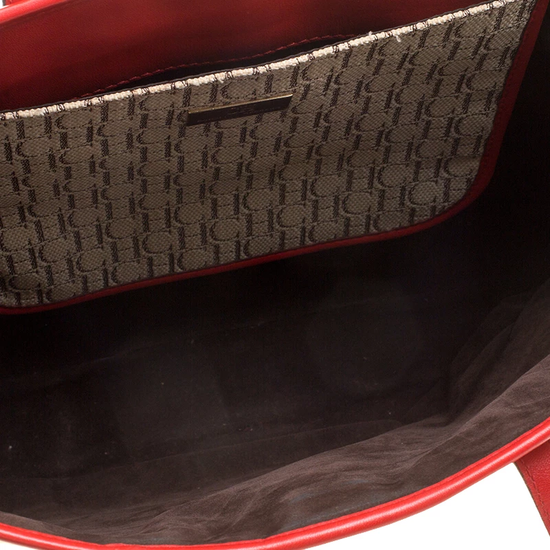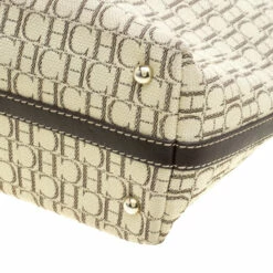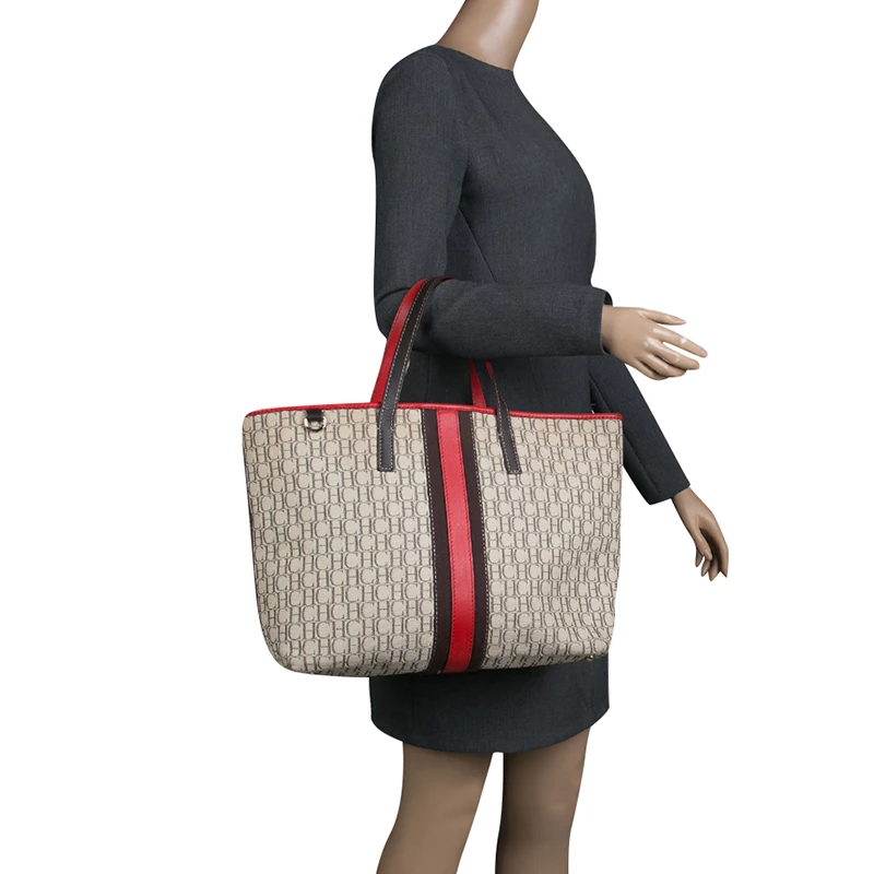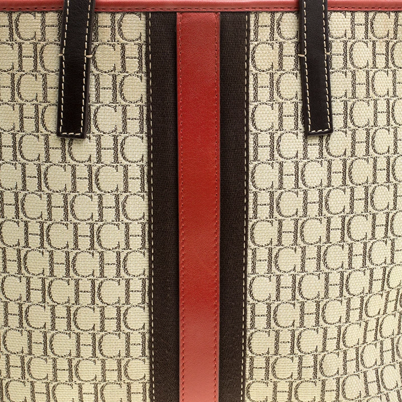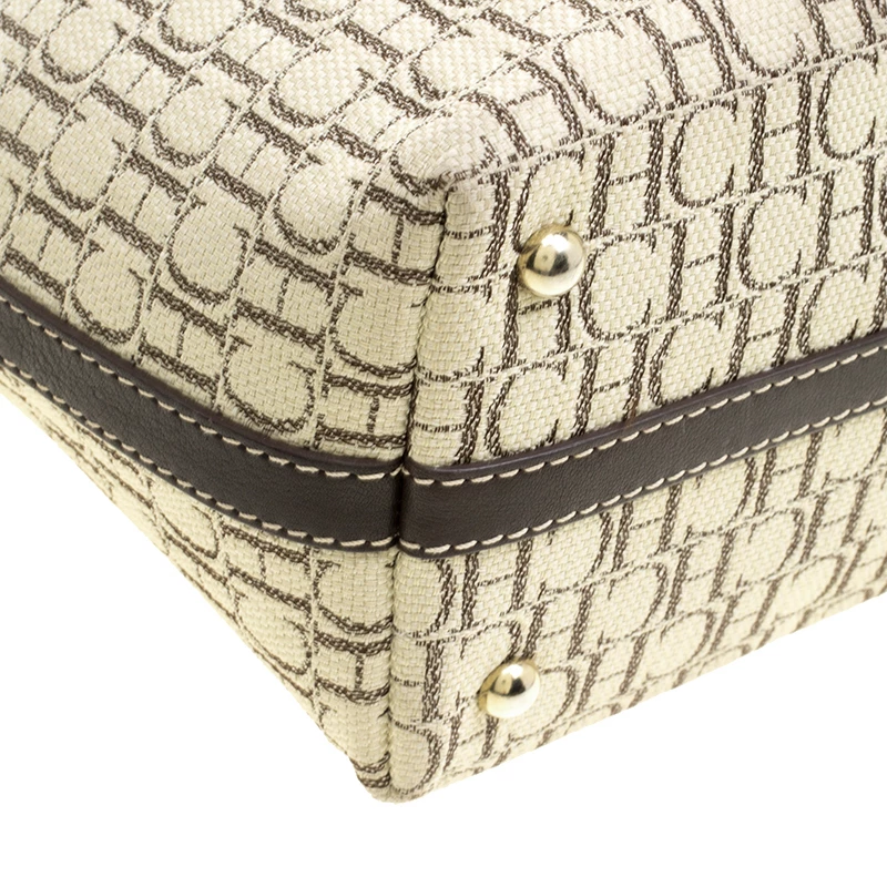 This sophisticated tote from the house of Carolina Herrera will make a fine addition to your closet. Crafted from monogram canvas and styled with leather trims the bag features dual handles. It has a spacious fabric lined interior that houses a slip pocket, and the tote comes with a pouch. Swing it along to work or on a lunch with friends.