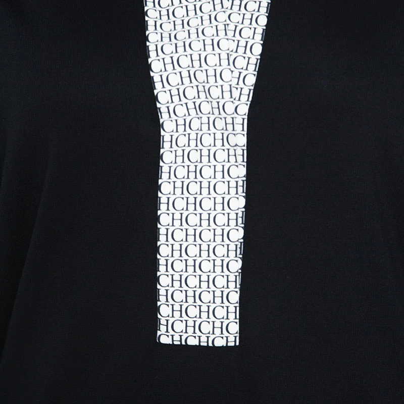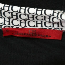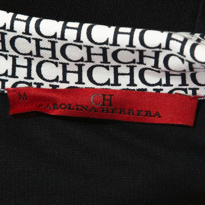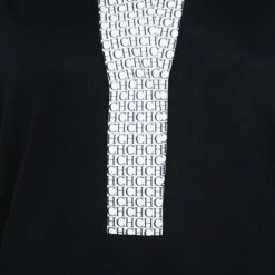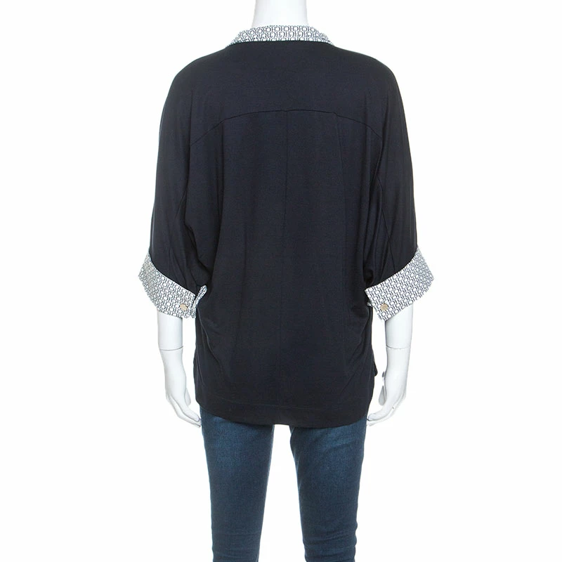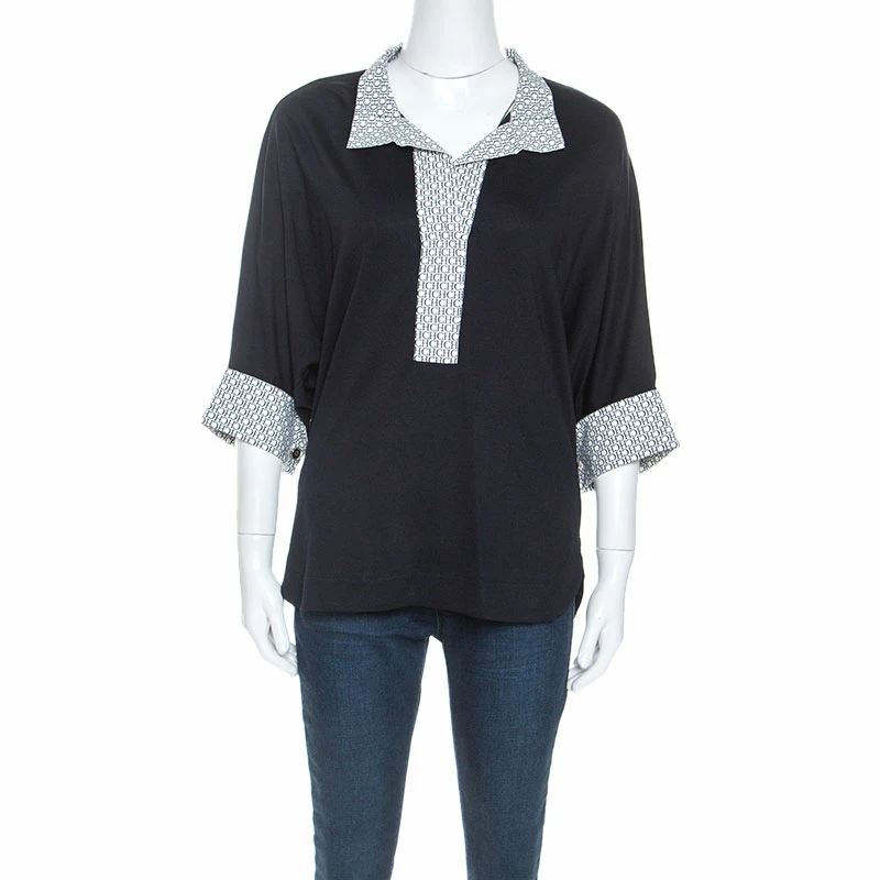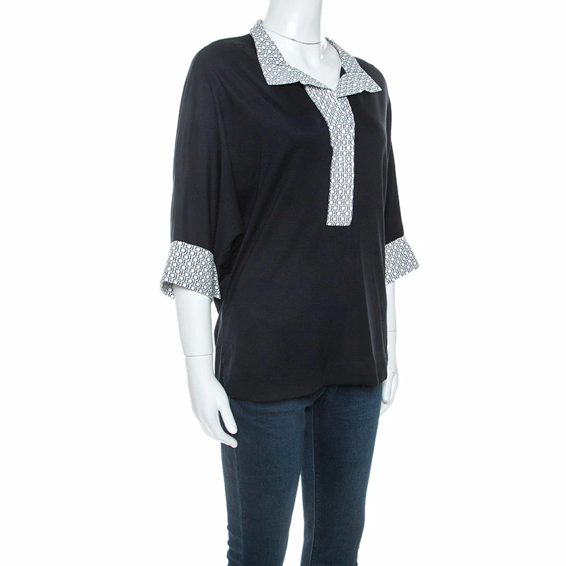 With a versatile range of styles and designs to choose from, Carolina Herrera sets another example with this top. This attractive navy blue top has signature monogram on the collar and dolman sleeves.