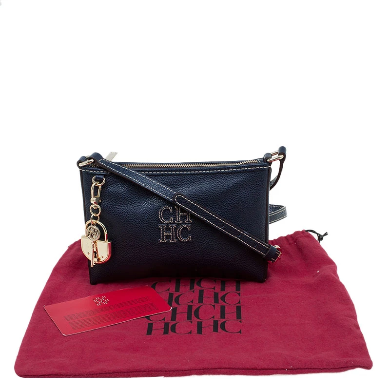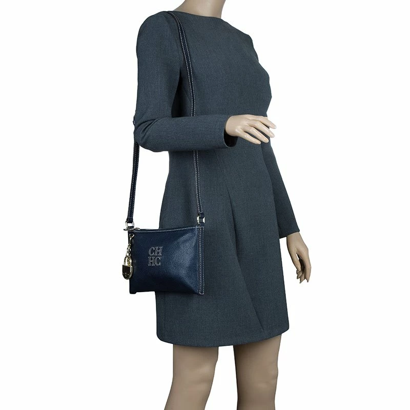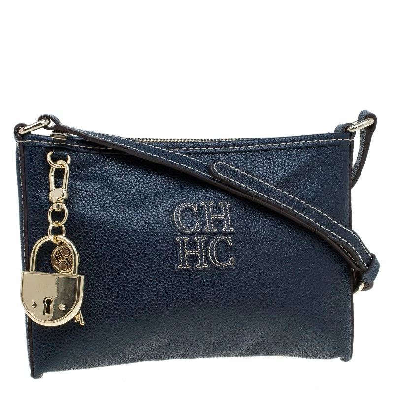 Be sure to finish your look with this light and stylish Leather Logo CH Crossbody bag by Carolina Herrera. It’s crafted from versatile blue leather. This crossbody bag is accented with stitched leather CH HC labels, a removable gold CH engraved padlock, key charms, and polished gold-tone hardware. With its long leather shoulder strap you can easily wear this bag across the body or on the shoulder.