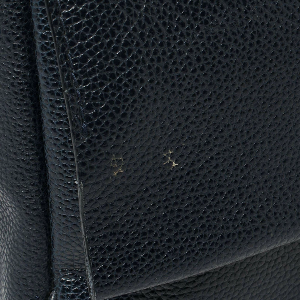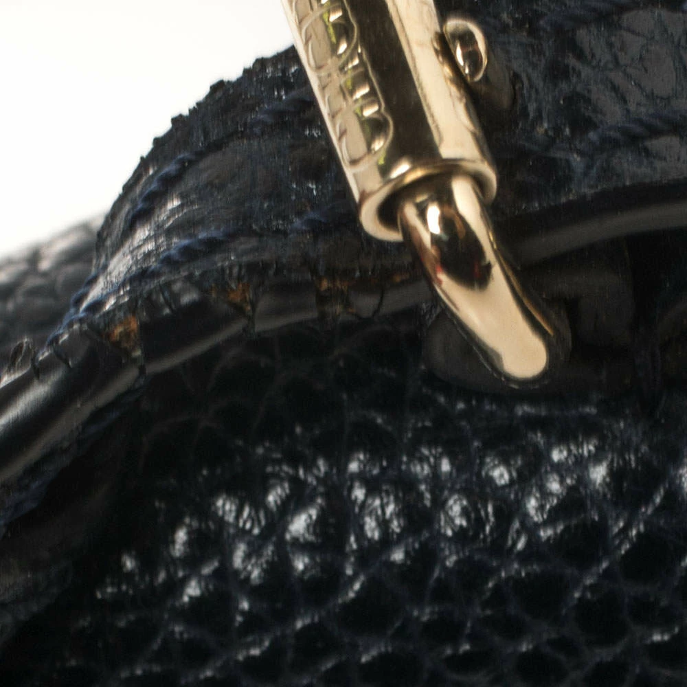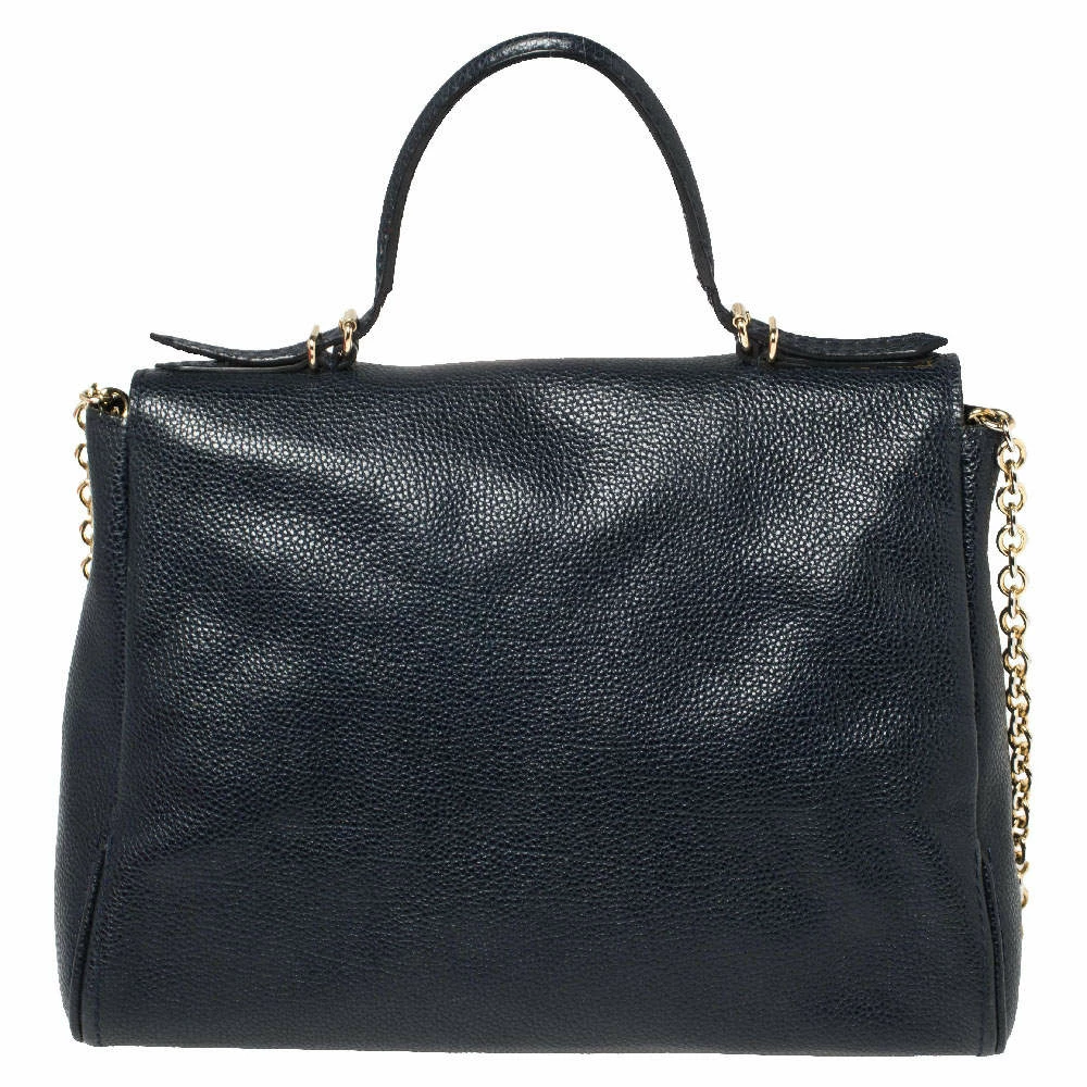 This practical and stylish Minueto bag from the luxury brand Carolina Herrera is crafted in navy blue leather. It features a front flap detailed with the brand logo in gold-tone hardware. The bag comes equipped with a single handle and a chain-link shoulder strap. It has a spacious interior for your everyday essentials.