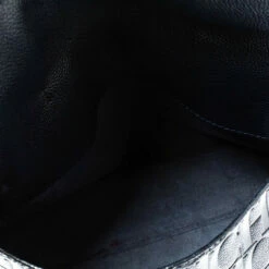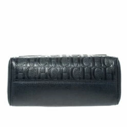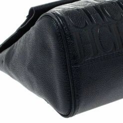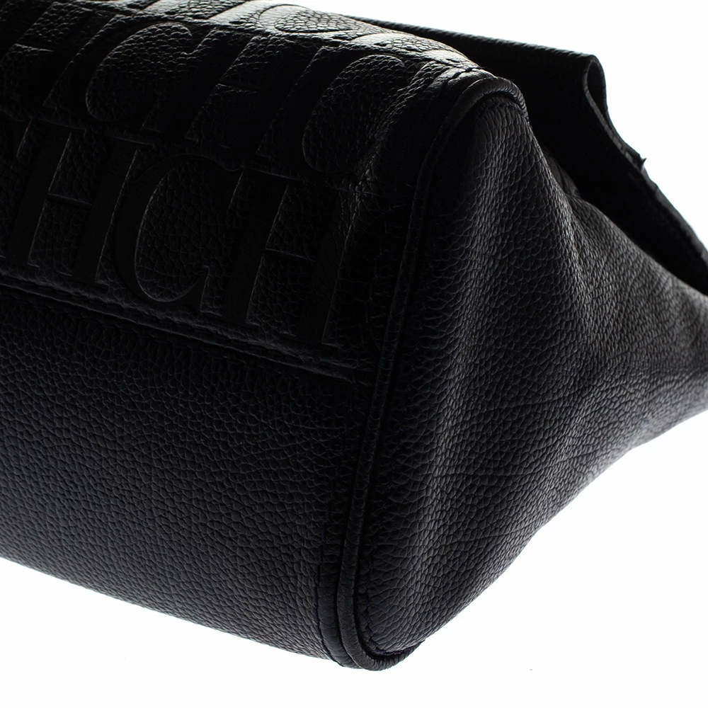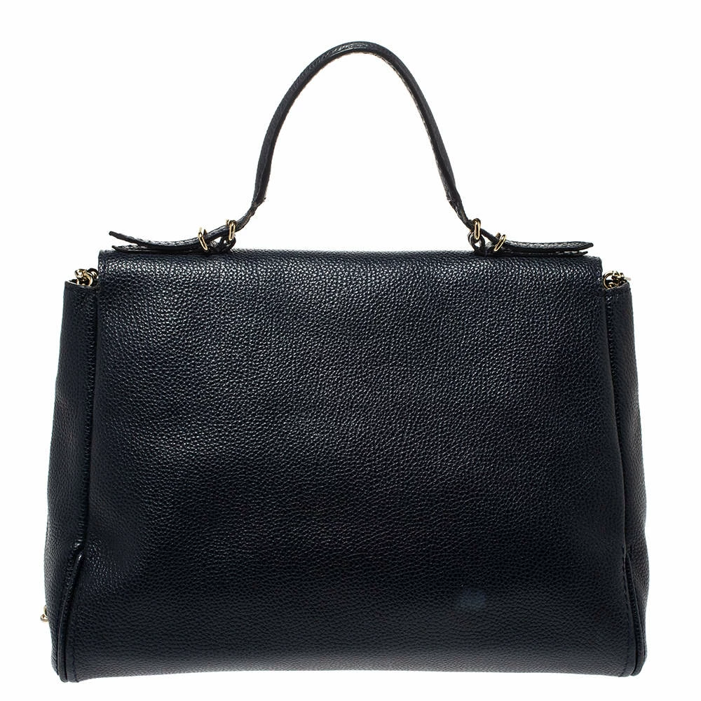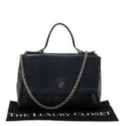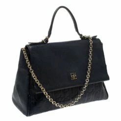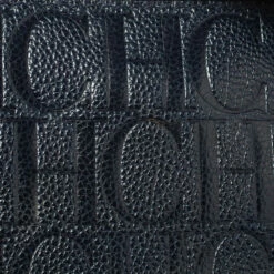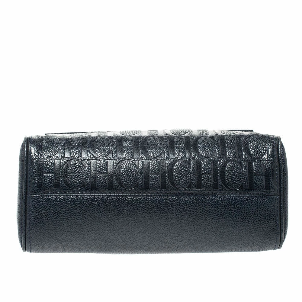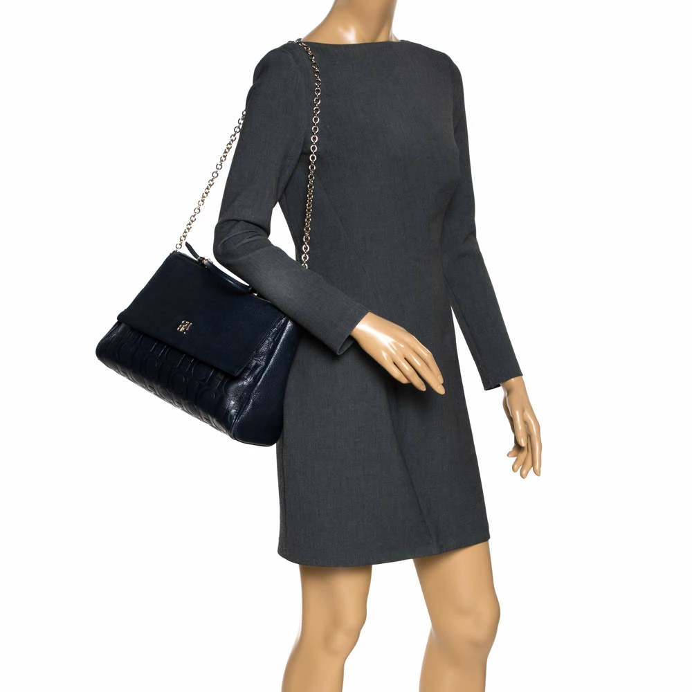 This practical and stylish bag from the luxury brand Carolina Herrera is crafted in navy blue, logo-embossed leather. It features a smooth, front flap detailed with gold-tone brand logo. The bag comes equipped with a single handle and a chain-link shoulder strap. It has a spacious interior.