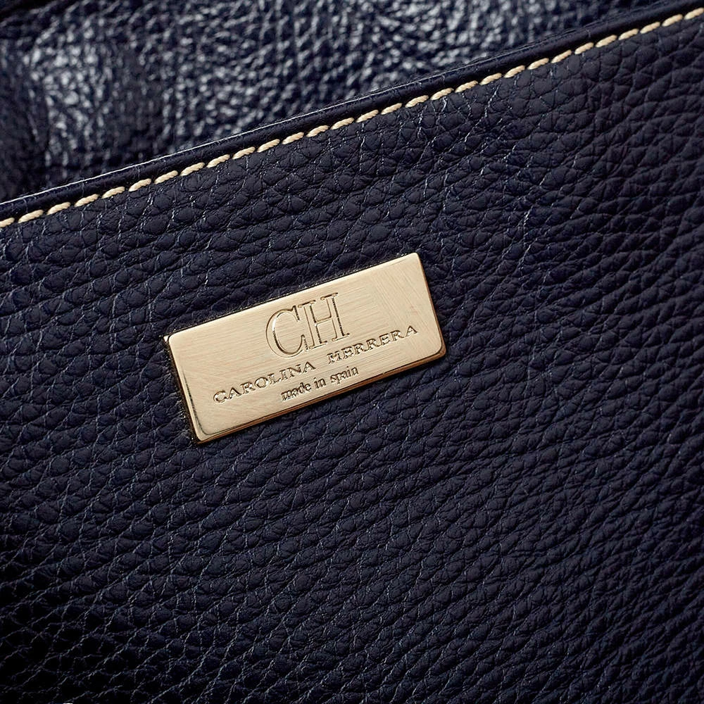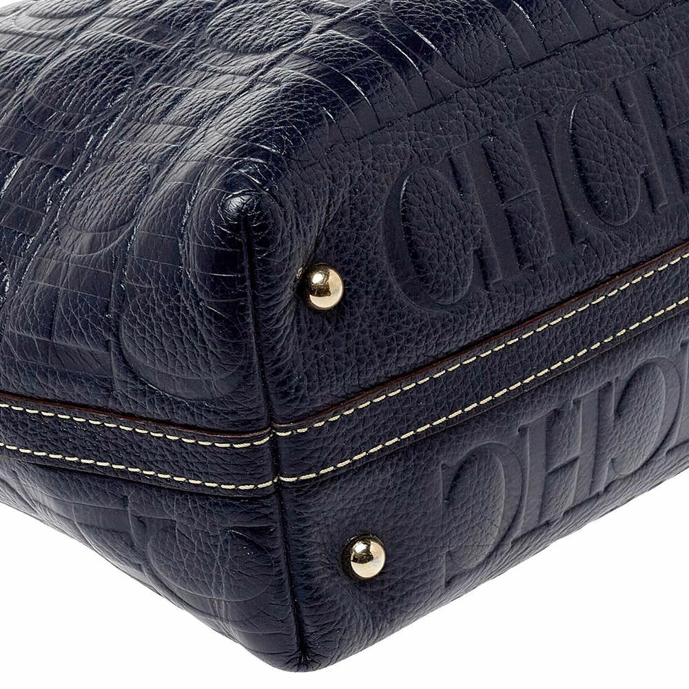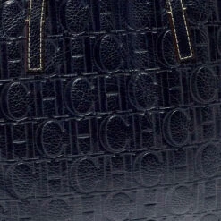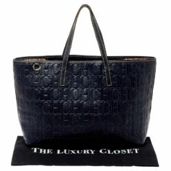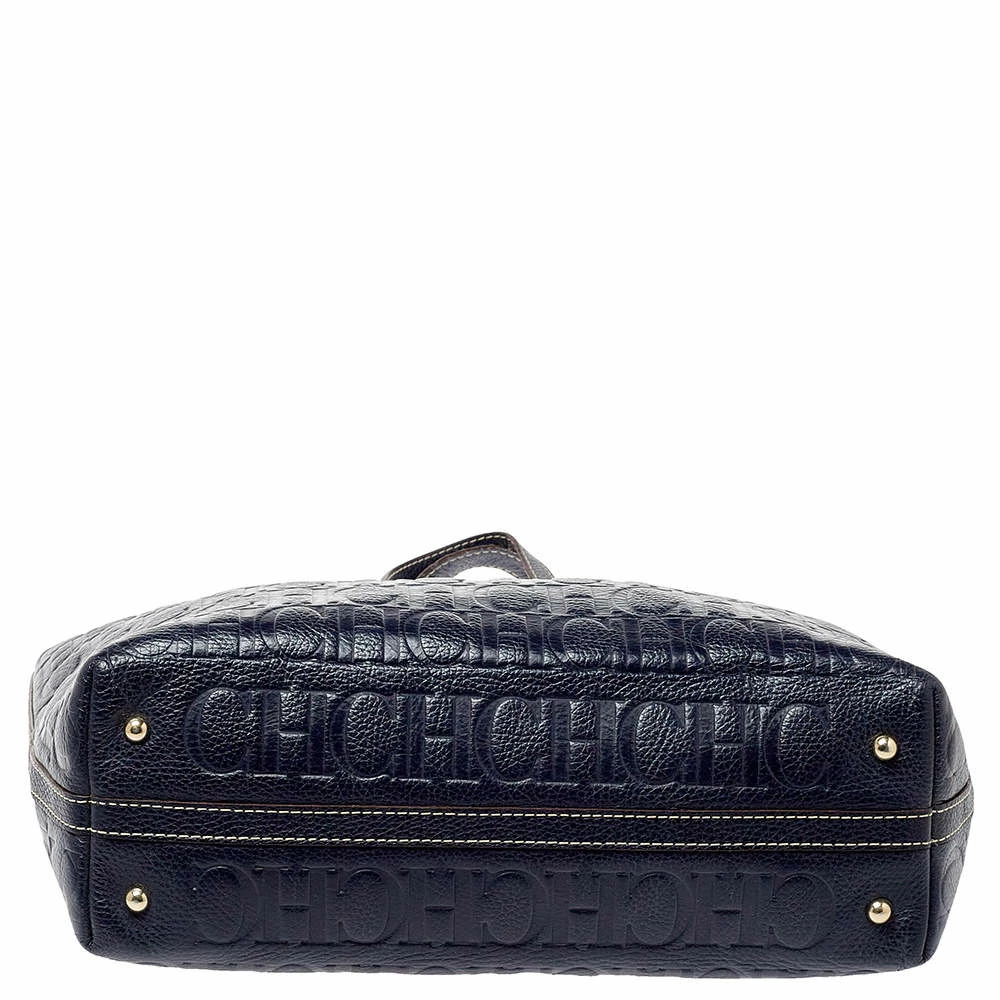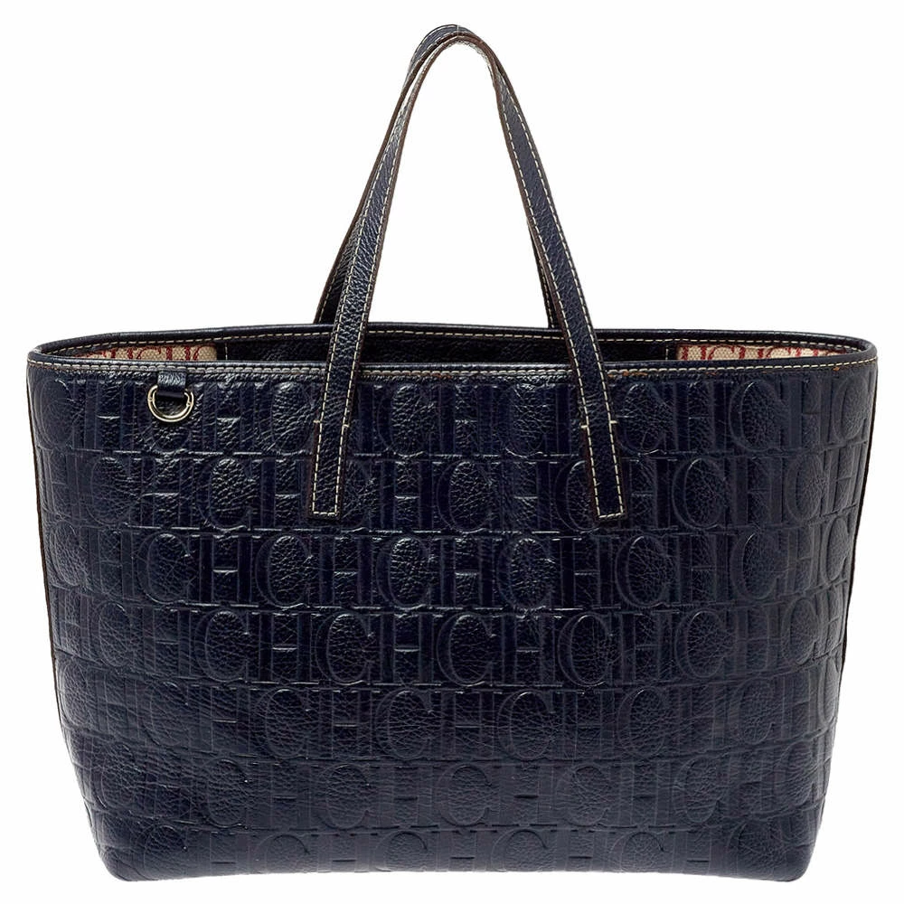 Make a stunning addition to your bag collection with this fabulous Carolina Herrara tote. This bag is made from navy blue monogram-embossed leather. It is equipped with two flat handles, and the base has four protective feet. The spacious canvas-lined interior can carry your belongings safely.