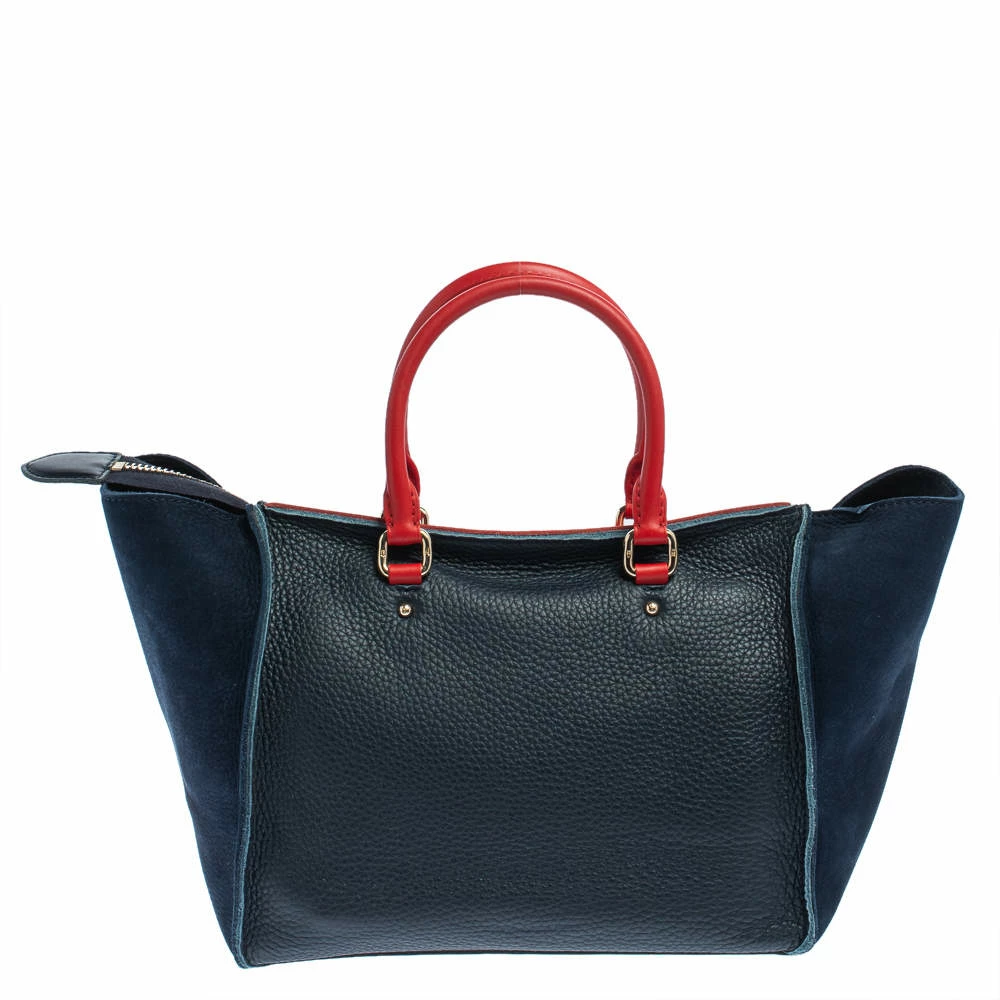 Carolina Herrera is renowned for her ‘Exceptional personal style’ and a well-known name in dressing the First Ladies. The Vendome tote is designed in gorgeous navy blue & red nubuck leather & leather in a structured silhouette. It comes with two rolled top handles and protective base studs. This bag opens to an ultra-spacious interior that can conveniently hold all your essentials.