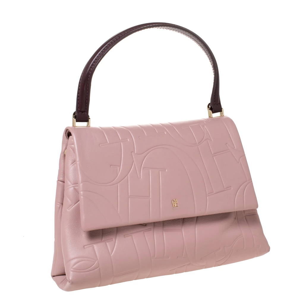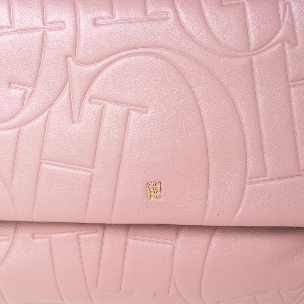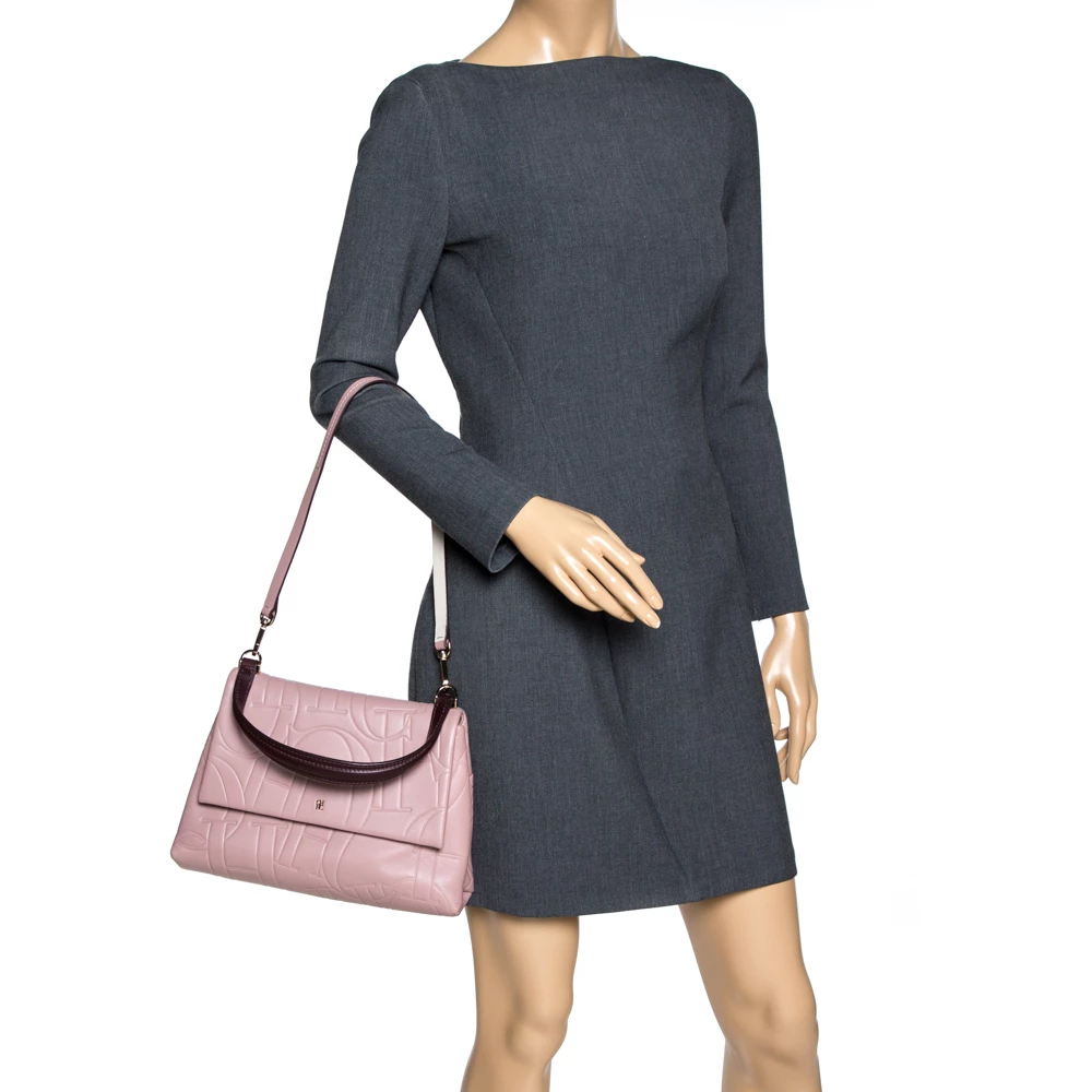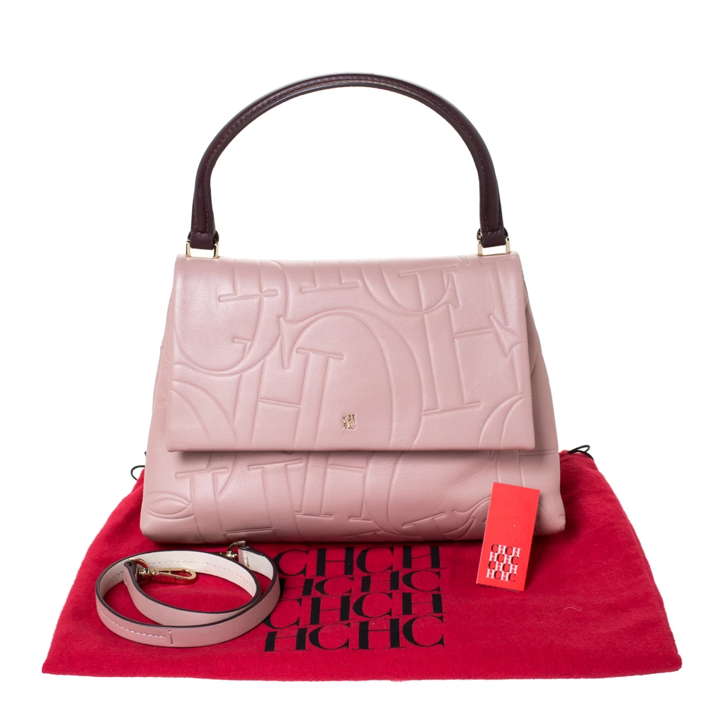This lovely top handle bag by Carolina Herrera has been crafted from embossed leather and comes in a lovely shade of pink. It has a front flap, top handle, shoulder strap, brand logo, fabric-lined interior, and gold-tone hardware.