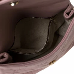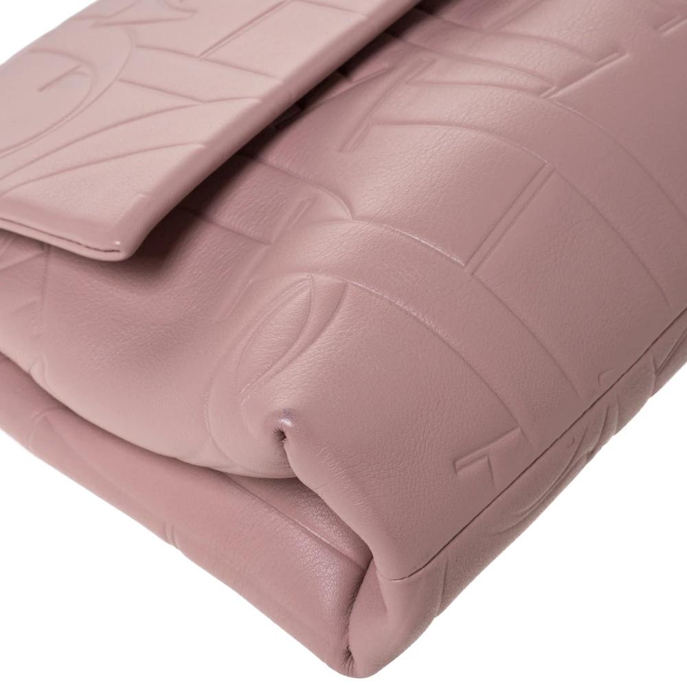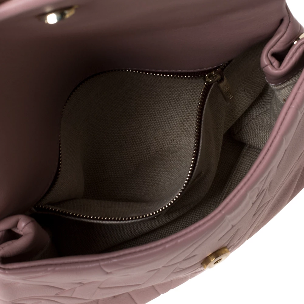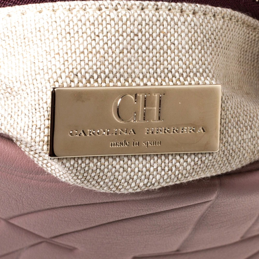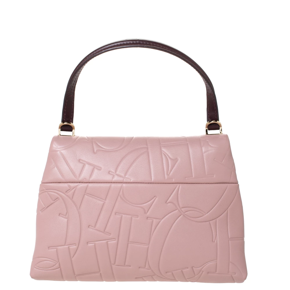 This lovely top handle bag by Carolina Herrera has been crafted from embossed leather and comes in a lovely shade of pink. It has a front flap, top handle, shoulder strap, brand logo, fabric-lined interior, and gold-tone hardware.