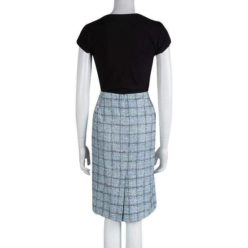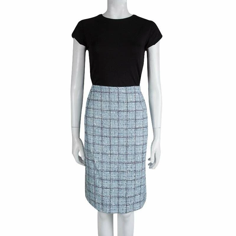 Tweed and a pencil fit, perfect! Another sophisticated design from Carolina Herrera, this pencil skirt is perfect to flaunt to work. In a beautiful powder blue checked tweed the skirt fits well at your waist. Darts, zipper closure at the center back and back slit gives a great fit and ease. Wear it with sharp solid color blouses and shirts. Add on a pair of high pump heels and add to the look.