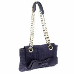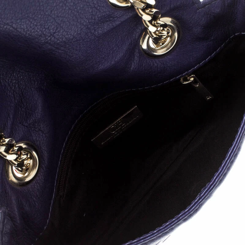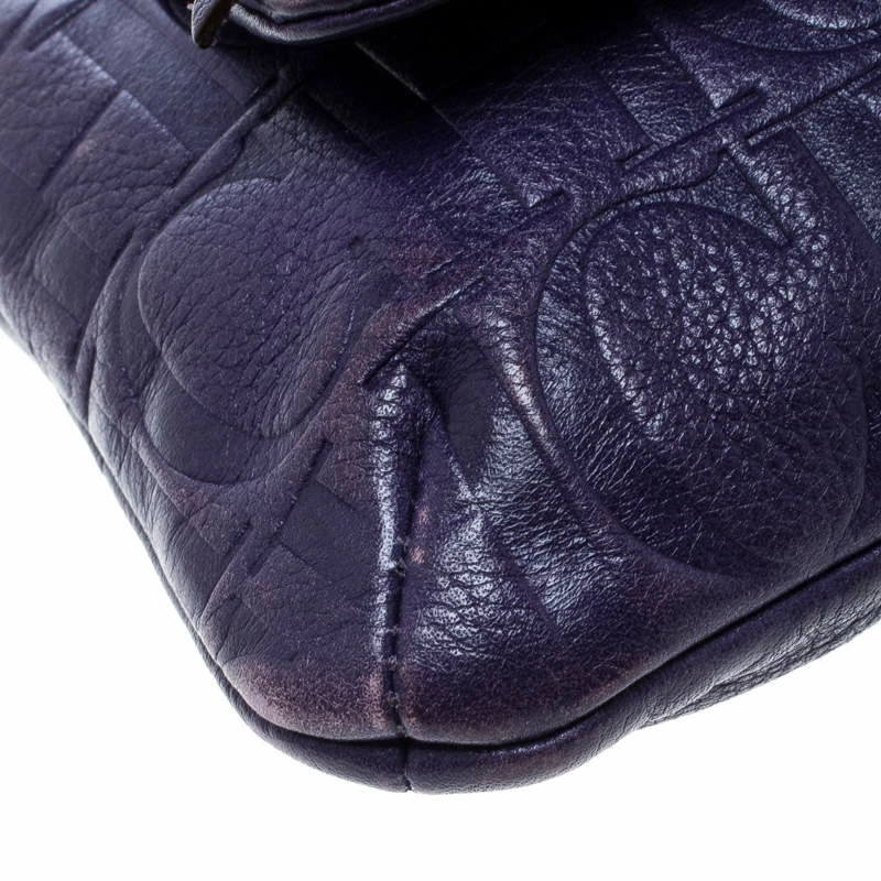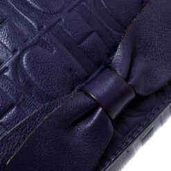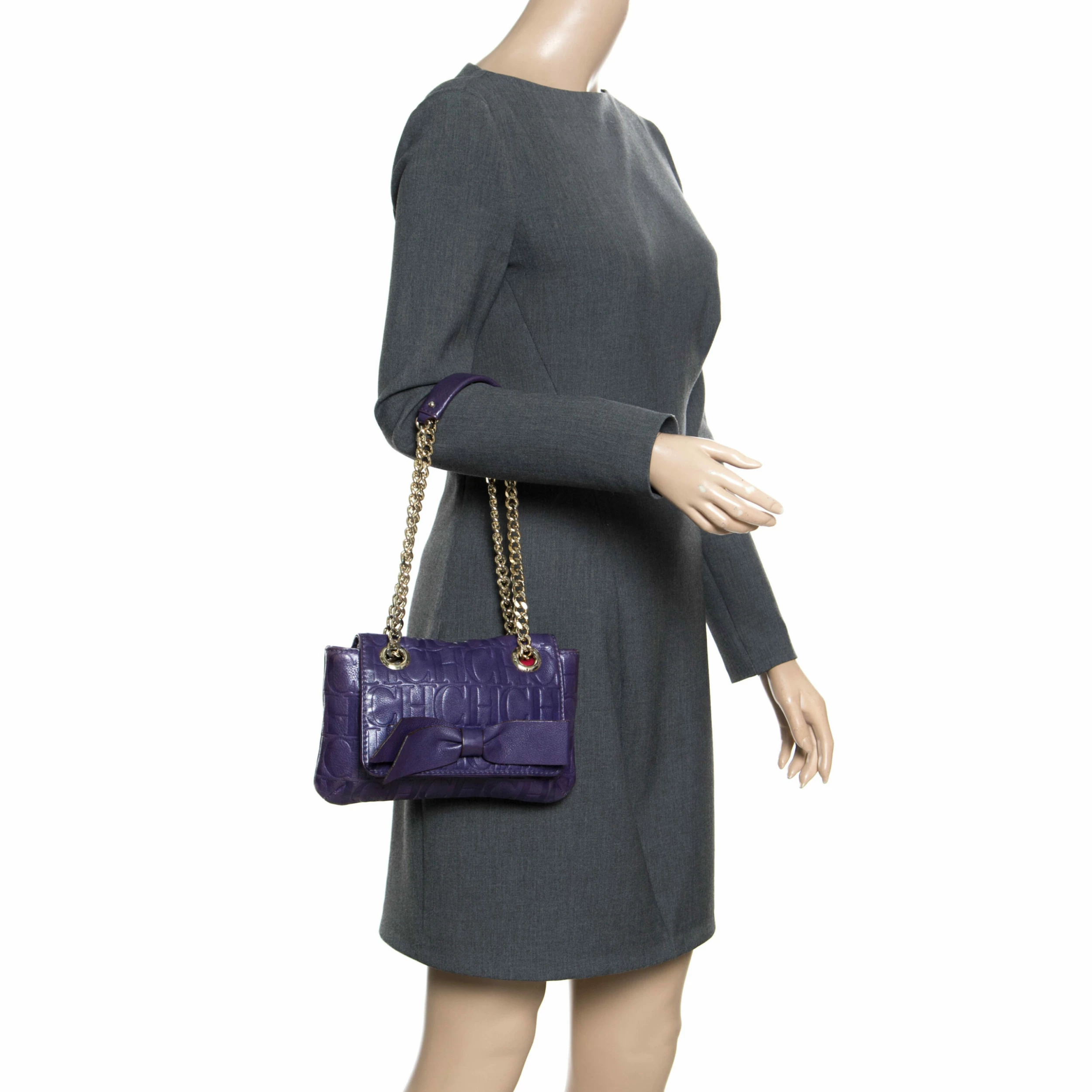 This Audrey bag from Carolina Herrera is styled with a bow detail on the front. It is crafted with signature monogram leather in a pretty purple color and a flap top that leads to a fabric-lined interior with a side zip pocket. The bag also features dual chain link straps with leather shoulder rest.
