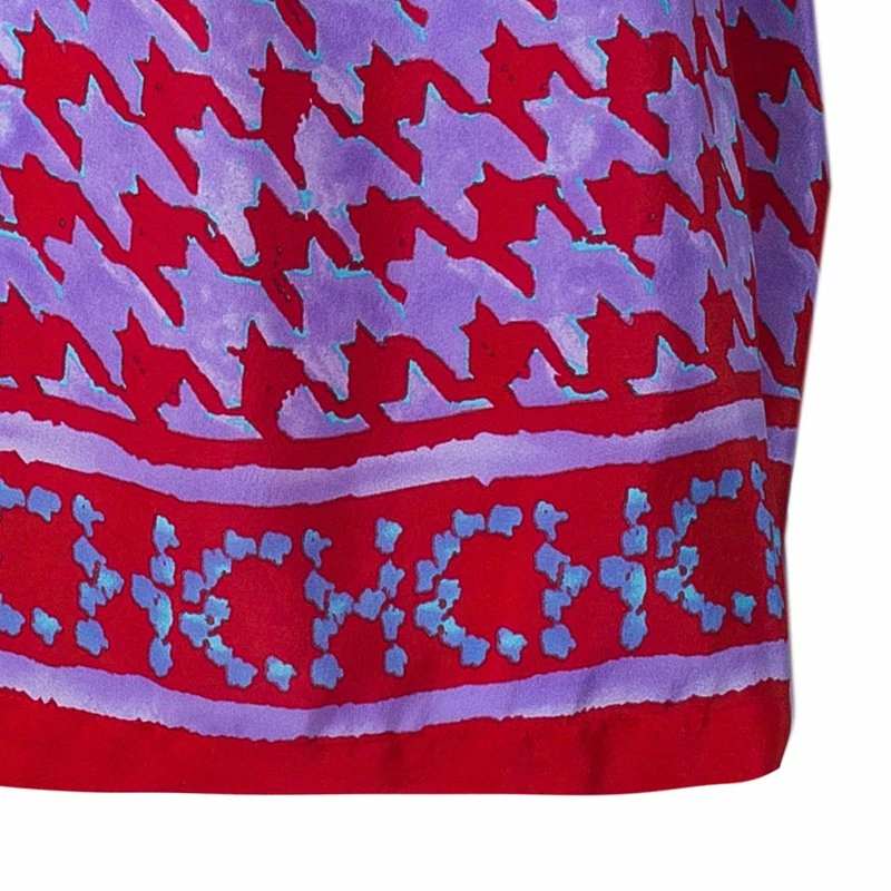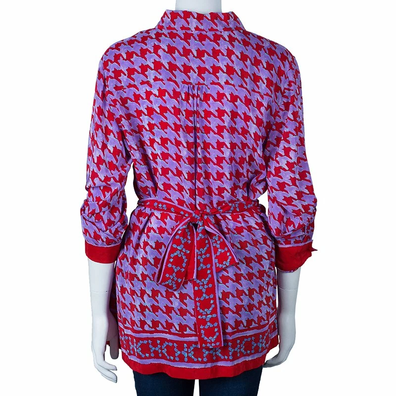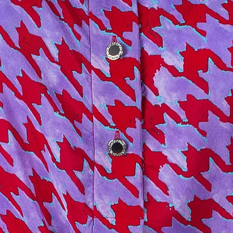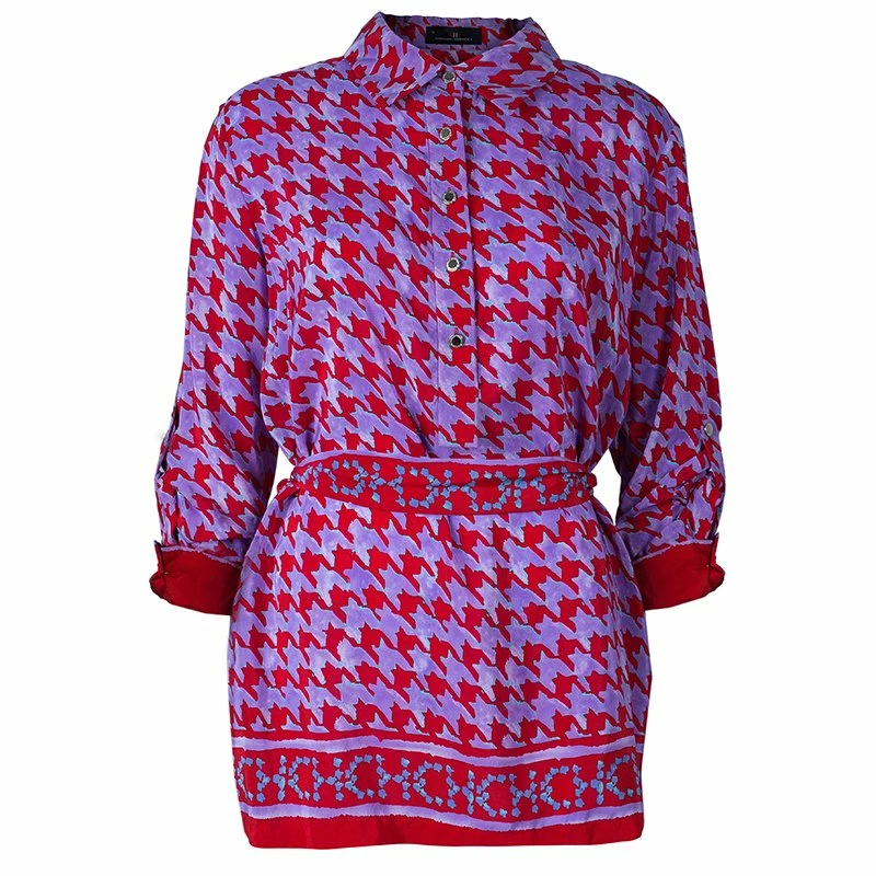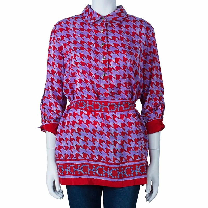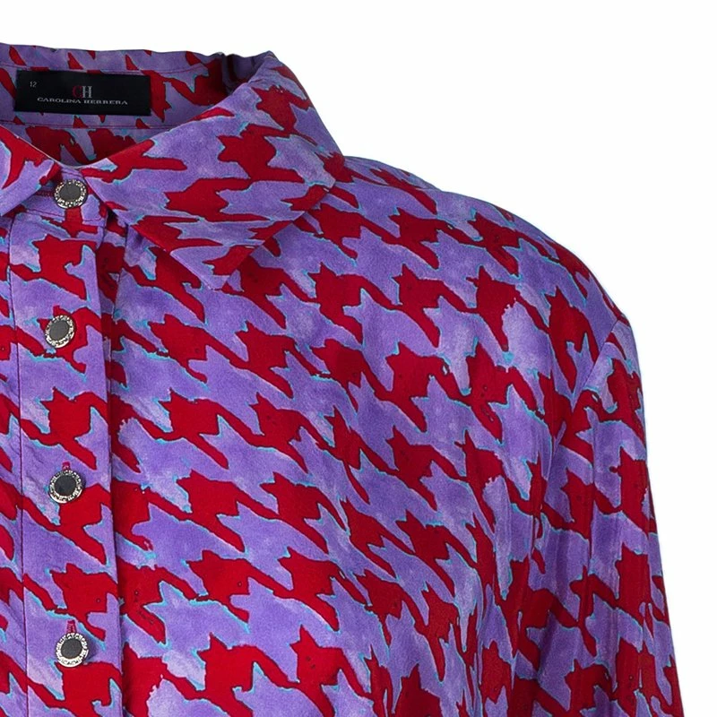 Carolina Herrera’s purple red Houndstooth printed top is a must have. Made from a blend of rayon and silk, it features a traditional button up collar, long sleeves that can be rolled up, and a waist band with logo printed that can be tied at the waist for fitted comfort.