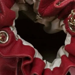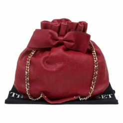 Structured as a bucket bag, this piece from Carolina Herrera is made from rich red leather. The exterior is embossed with the signature CH monogram and the top is cinched with gold-tone grommets and chain. Four protective feet are placed at the bottom. It can be carried by the chain strap.