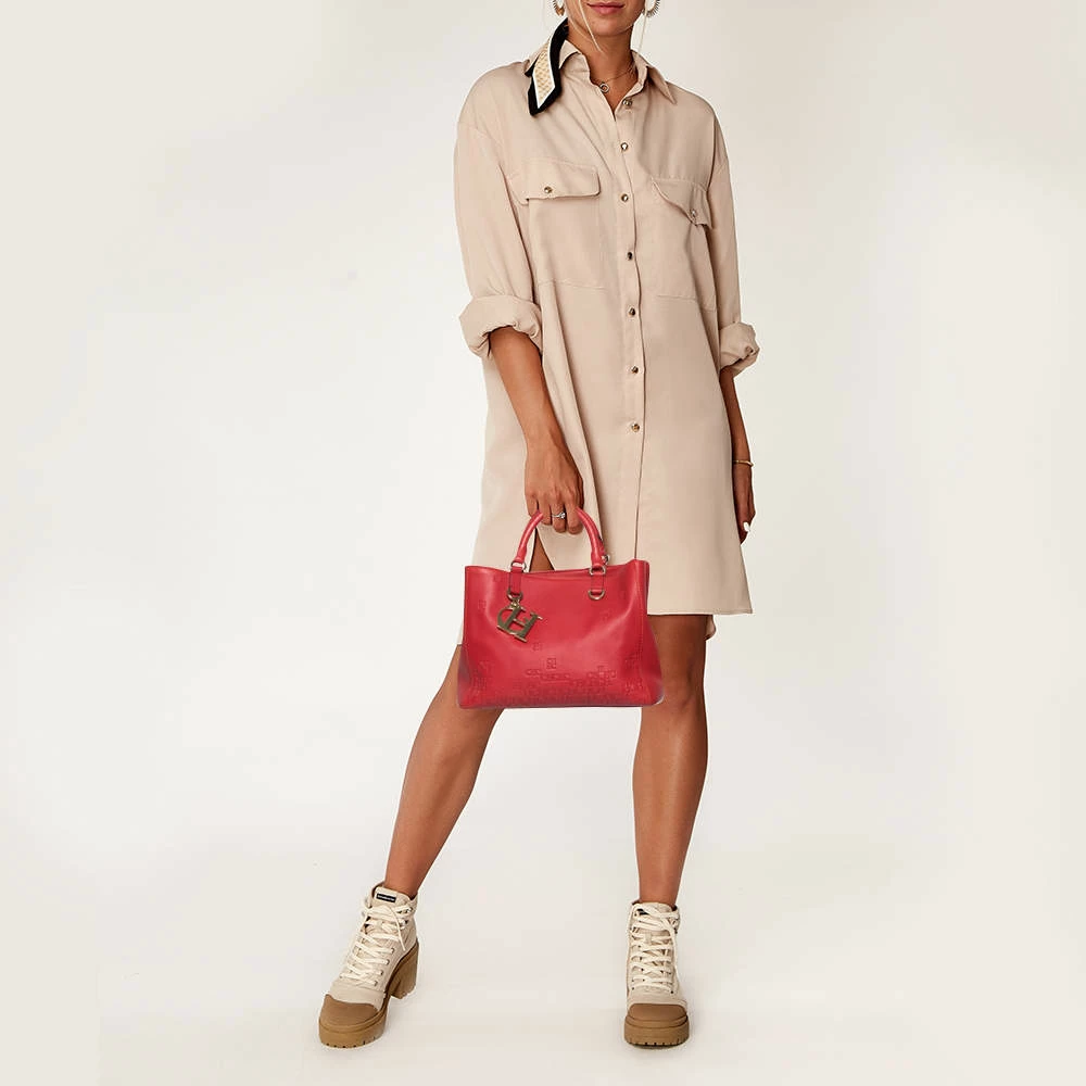 Exhibit your fondness for luxurious styles with this leather bag. The well-sized canvas interior, optional shoulder strap, and two top handles make this bag functional. This tote by Carolina Herrera has been designed to assist you with the utmost ease on all days. It is finished with the CH charm on the front.