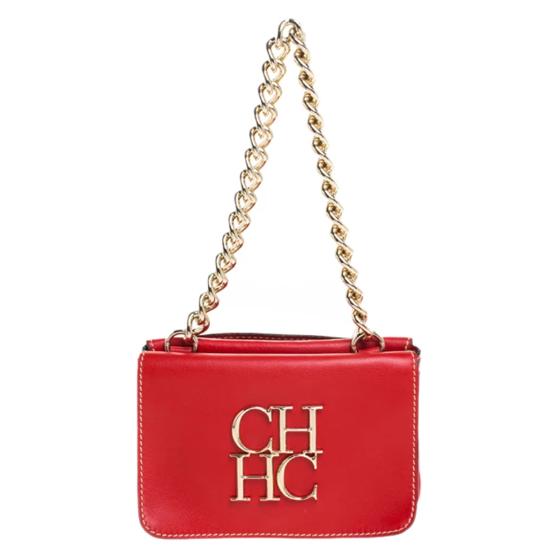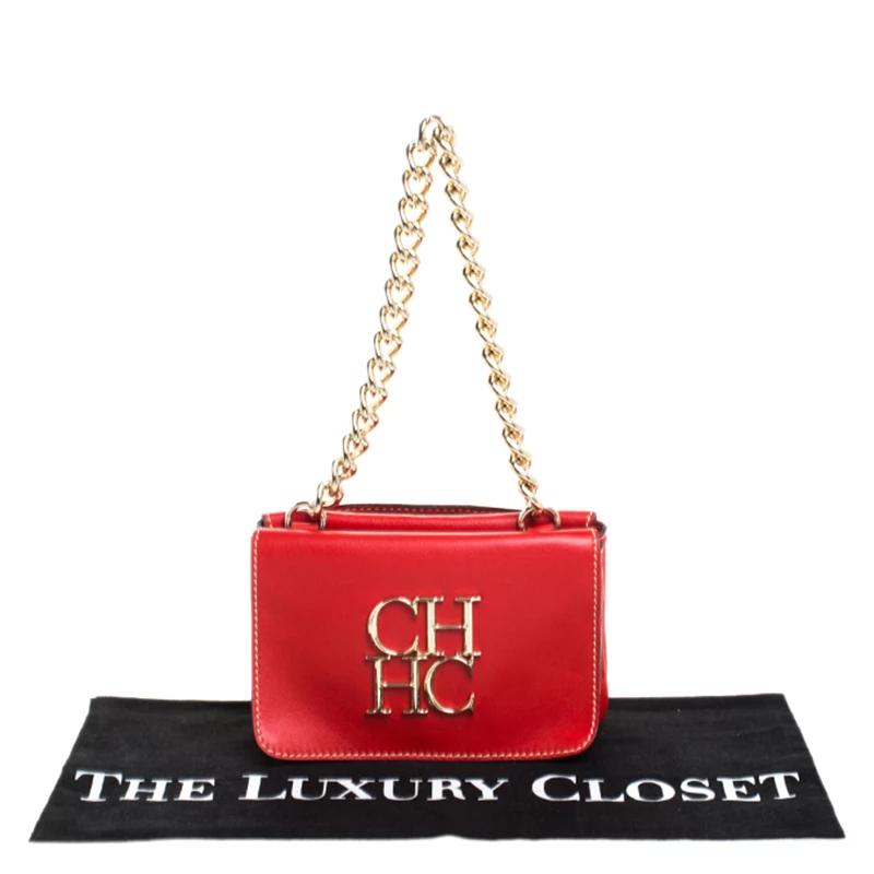 Made of superior quality, this Carolina Herrera handbag is a must-have. Crafted from striking red leather, it will add a pop of color to every outfit. It is styled with a front flap with the brand logo that opens to a nylon-lined interior with enough space for essentials. It is finished with a chain-link strap and gold-tone hardware.