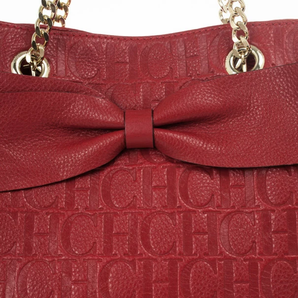 Paint the town red with this New Anna bag by Carolina Herrera. This bag is made from monogram embossed leather and features CH marked gold toned hardware and two chain-link and leather handles. A bow tie is accenting the exterior on front. The canvas lined interior comes with one large zipper pocket. Original Retail Price: US $937