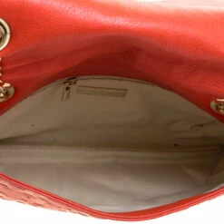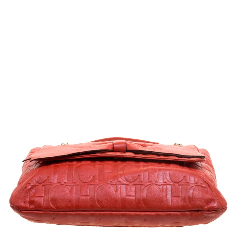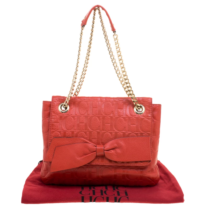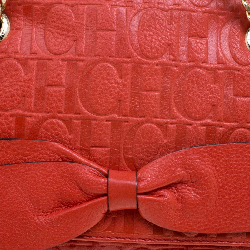 This elegant Audrey bag from Carolina Herrera comes with a bow detail on the front. Crafted from signature red monogram leather the bag features a chain link strap with a leather shoulder rest. The front flap opens to a fabric lined interior that houses a zip pocket.