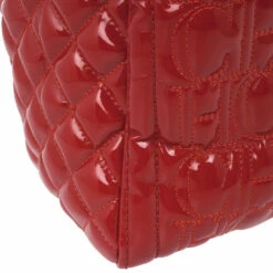 Shine in the center of the crowd with this red Carolina Herrera tote. Its oversized design with the bubble monogrammed stitching on its patent leather exterior give it a fun and funky attitude. Its large light gold-tone chains are intertwined red patent leather straps and monogrammed eyelets. Lined with bright red textile, the wide and spacious interior features one zip pocket with a monogrammed zipper tab and an engraved plaque.Original Retail Price: US $962