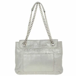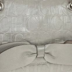 This bag from Carolina Herrera’s Audrey collection is an attractive handbag for your wardrobe. Crafted from Silver CH monogram leather, the exterior is accented with a leather bow, flap front closure, chain-link and leather straps for comfortable carrying and gold hardware. The black canvas lined interior features a zip pocket.Original Retail Price: US $786