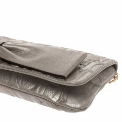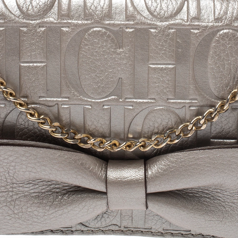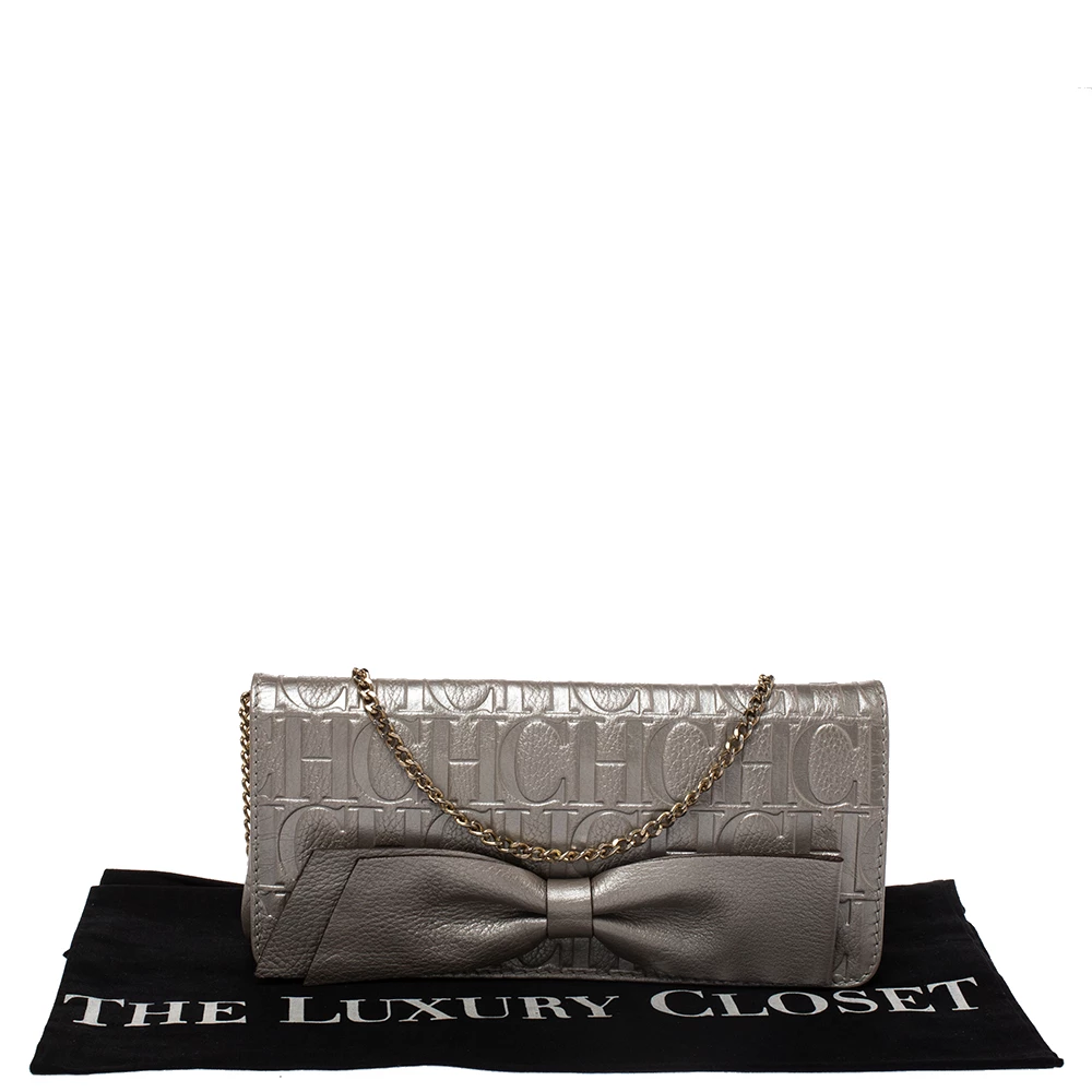 Stylish and glamorous, this clutch bag by Carolina Herrera is a must-have for evenings. Crafted from signature monogram leather, this silver-hues creation carries a large bow on the front flap. It opens to a spacious fabric interior and is finished with a chain-link & gold-tone hardware.