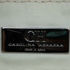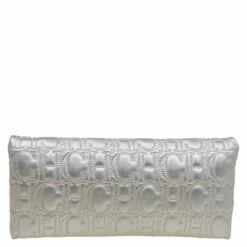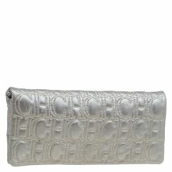 The silver monogram leather jerry clutch from Carolina Herrera goes well with any outfit. The clutch is crafted from leather, it has the CH HC stitch all over it. The clutch comes with a flap opening and has a magnetic snap closure. It has a fabric lined interior, a zipped pocket and a logo plaque that is gold tone.